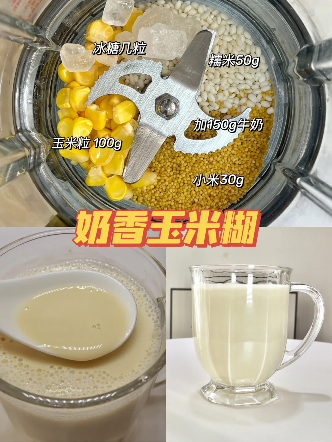 糯米50g 玉米粒100g 小米30g 冰糖几颗 牛奶150g