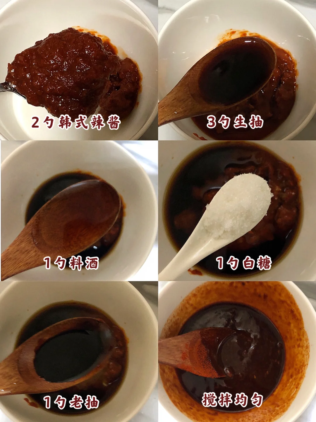 1️⃣先调酱汁:2勺韩式辣酱 3勺生抽 1勺料酒 1勺白糖 1勺老抽搅拌均匀