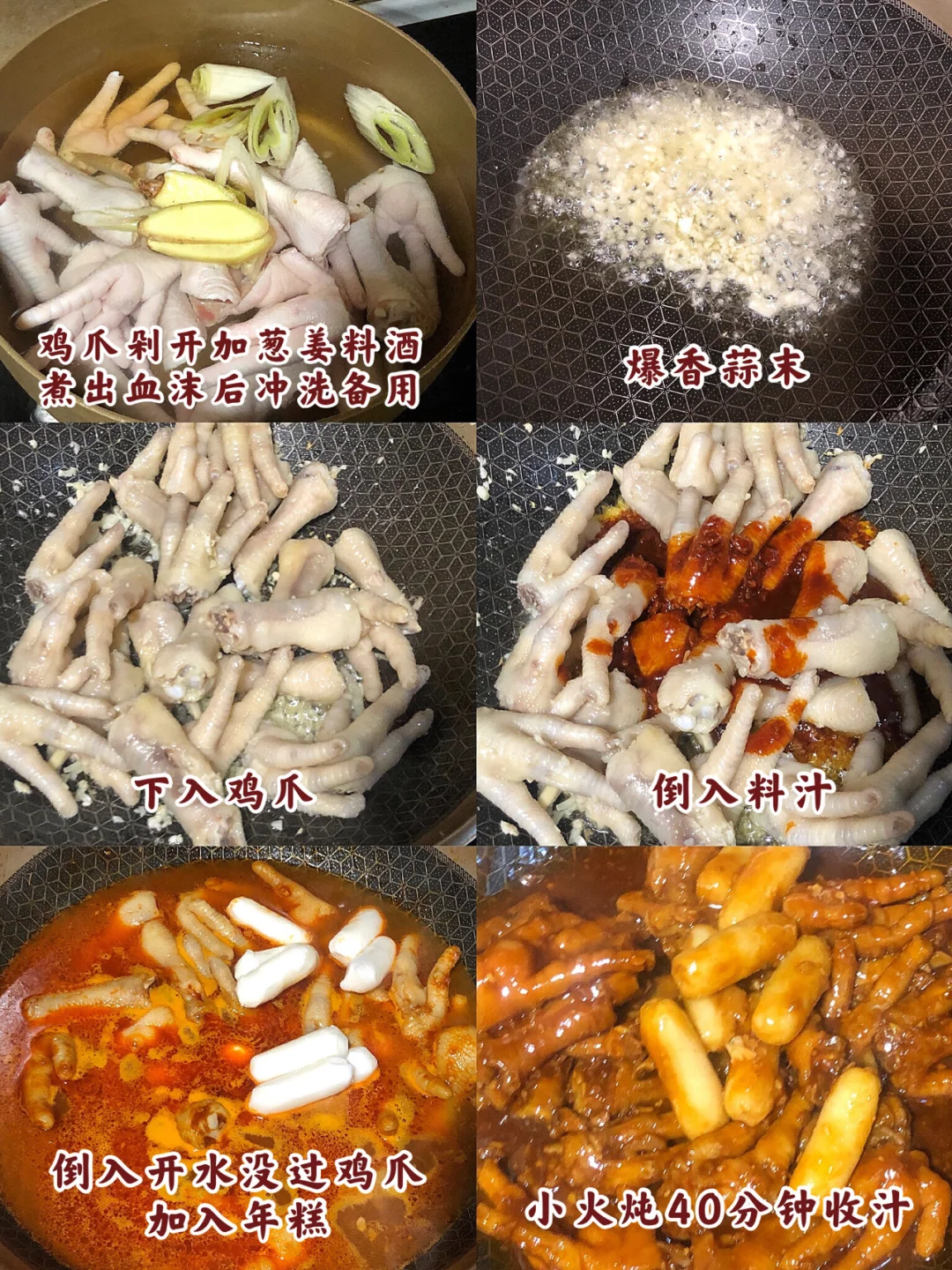 4️⃣倒入沸水没过鸡爪,把年糕加进去,水开后关小火炖40分钟左右然后大火收汁~