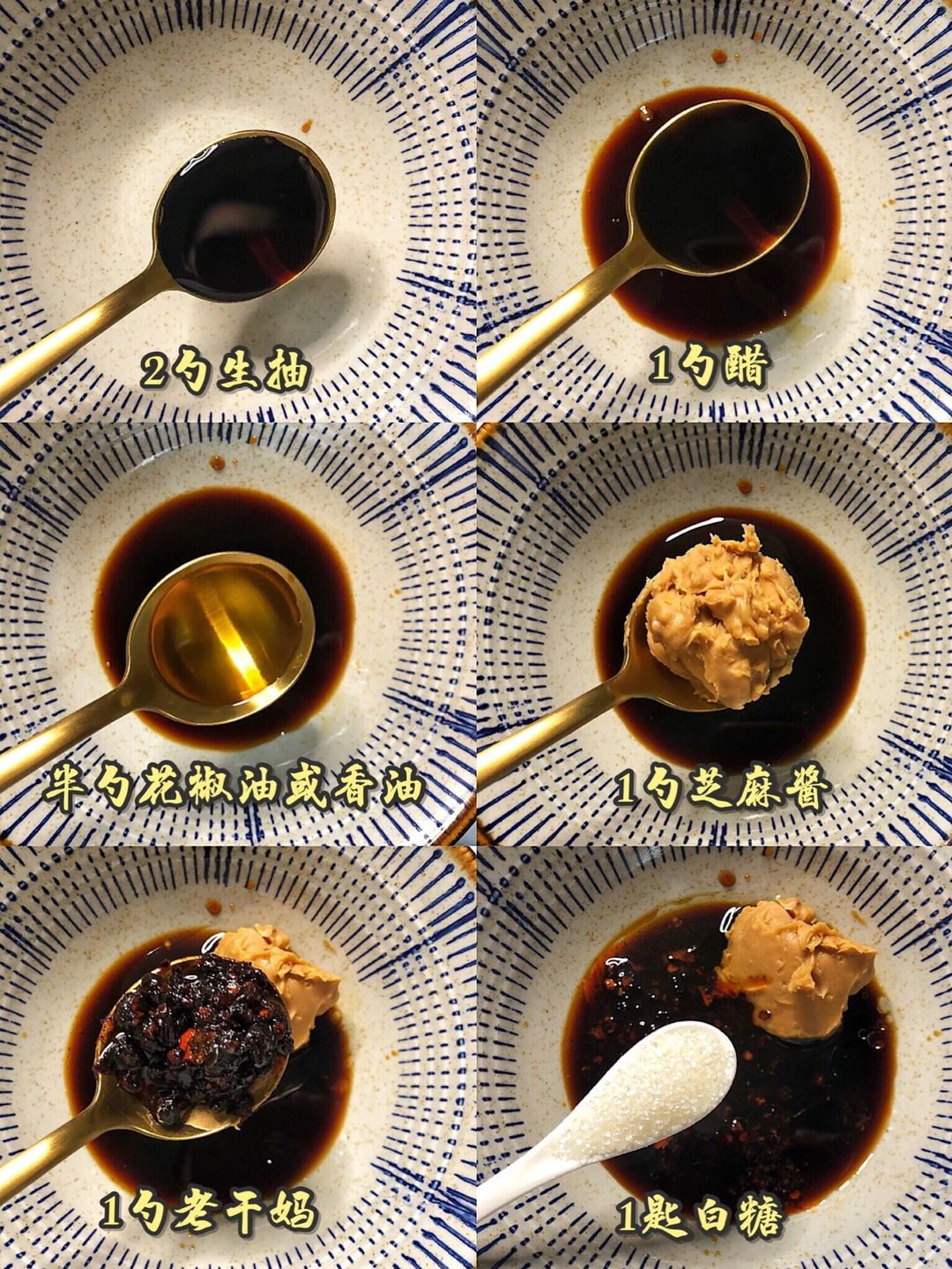 1️⃣调酱汁:两勺生抽,一勺醋,半勺花椒油(如果没有可以也可以用香油)一勺花生酱,一勺老干妈(不太能吃辣的就少放),一匙白糖调味