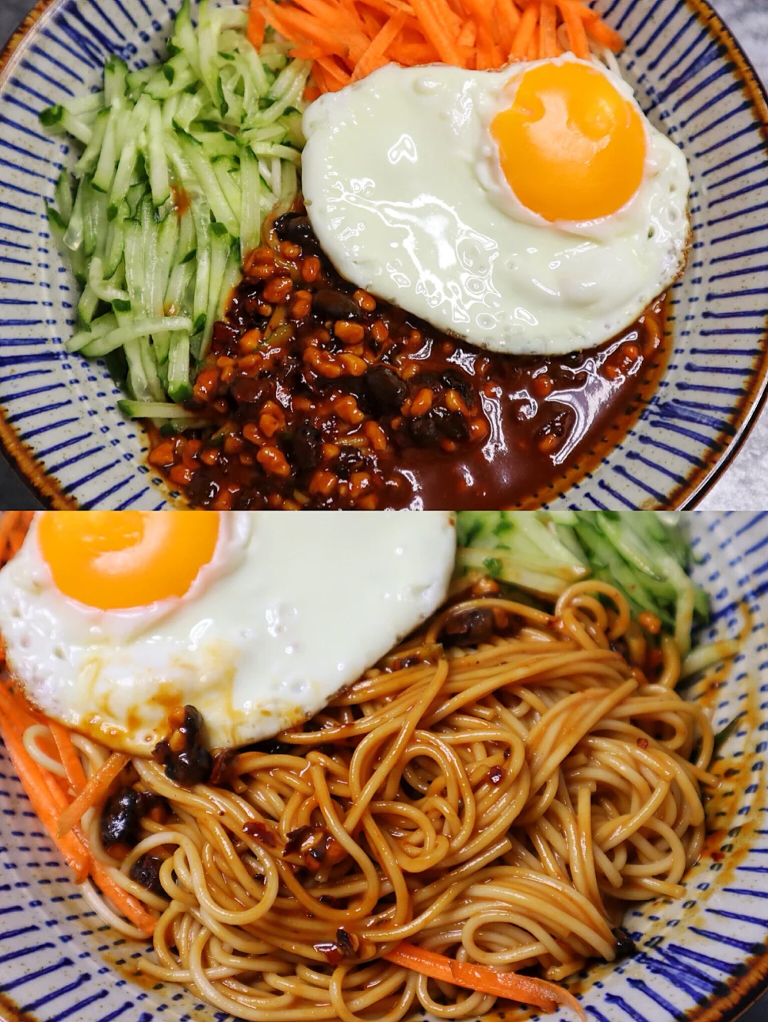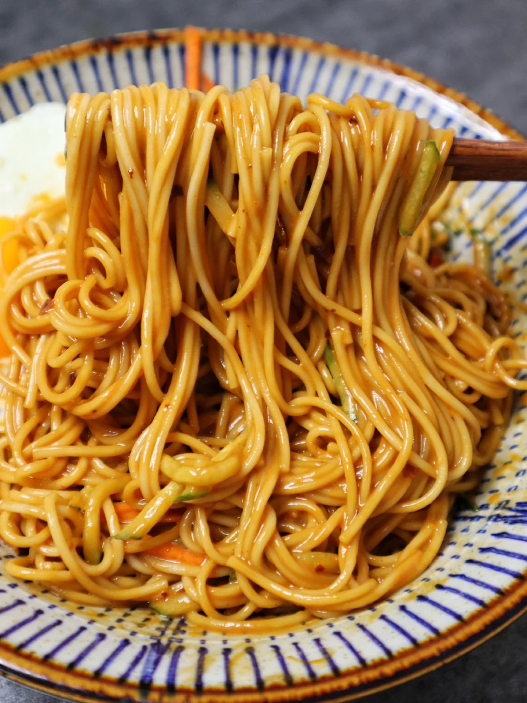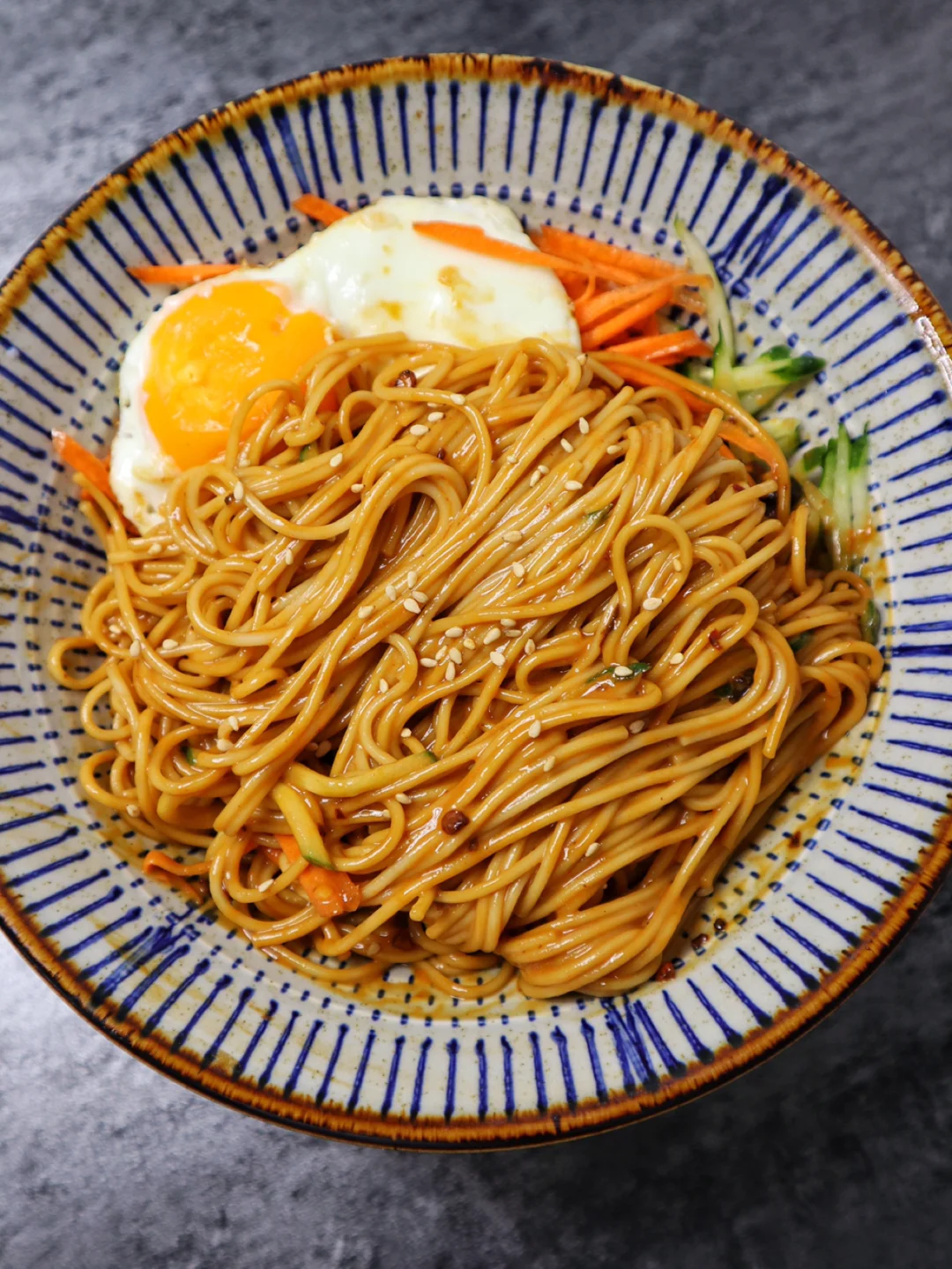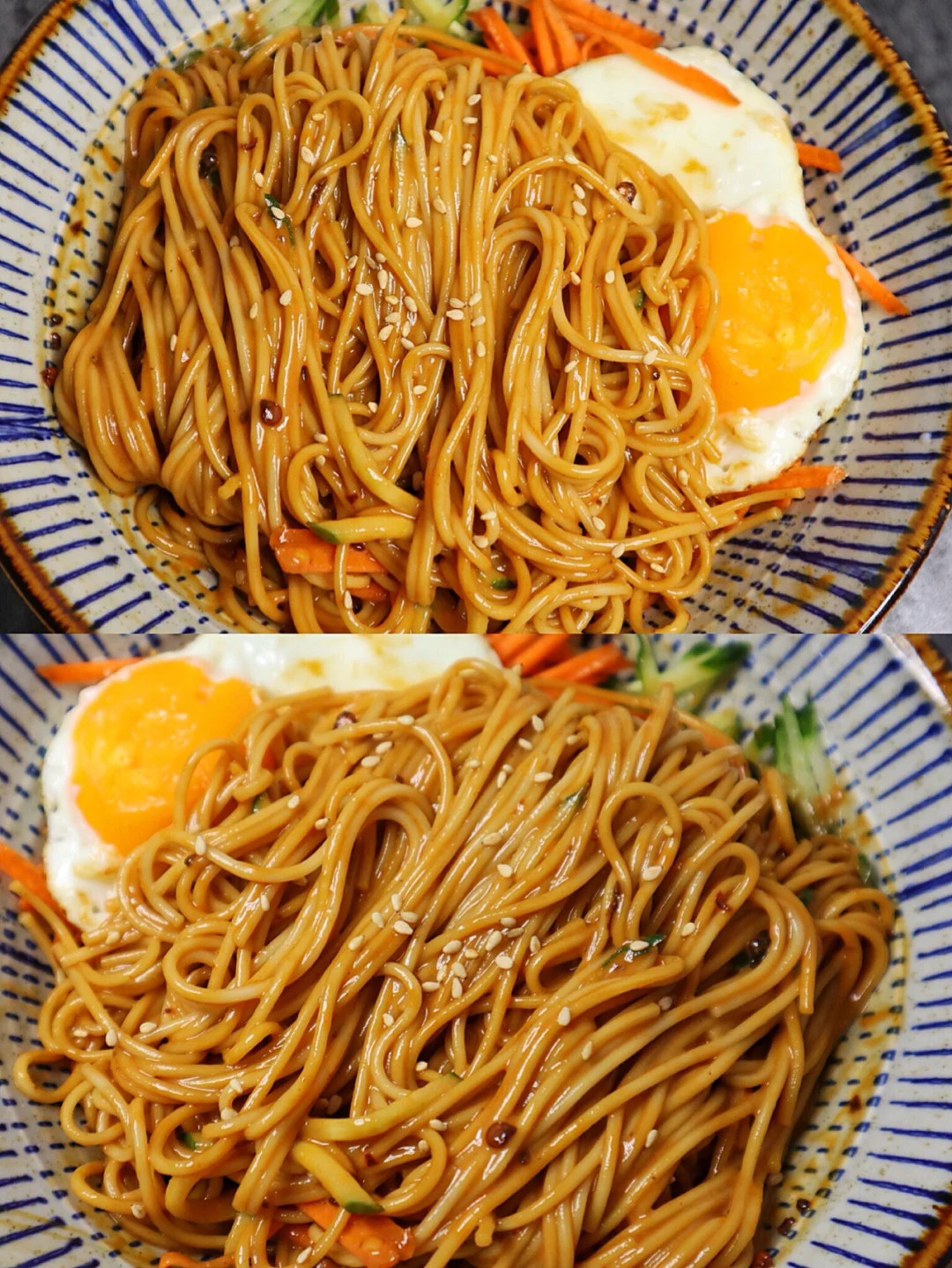 2️⃣面条煮熟煎一颗鸡蛋,黄瓜和胡萝卜切丝,然后和料汁拌在一起就可以吃了