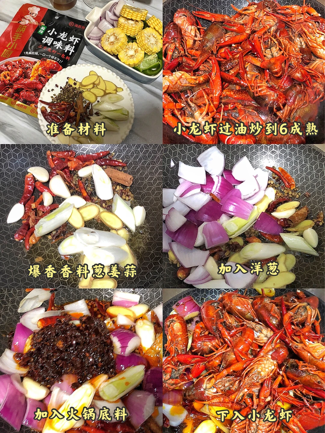 4️⃣锅里热油加入香料和葱姜蒜 洋葱炒香,不太能吃辣的就不要放辣椒了,然后加入火锅底料和小龙虾翻炒