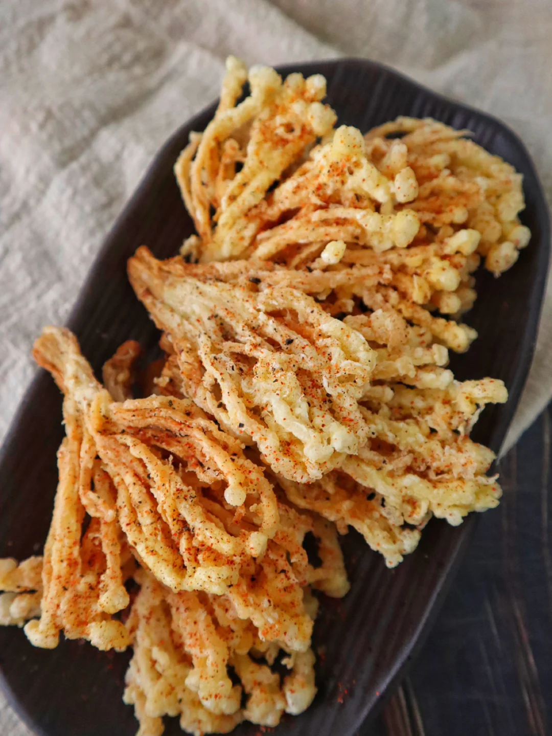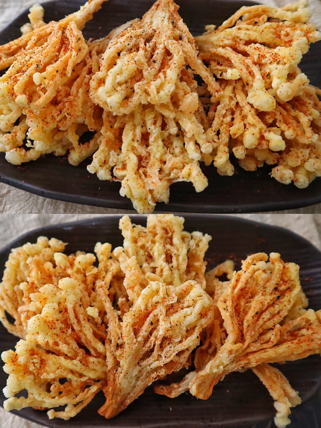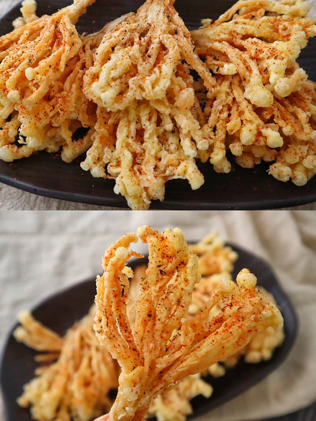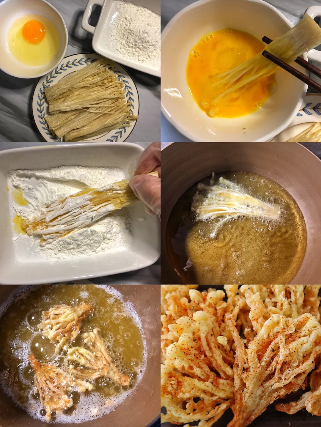 2️⃣金针菇裹一层鸡蛋再沾上淀粉,把筷子放到油锅里周围冒泡泡就可以下锅炸,中火炸到双面金黄捞出控油撒上辣椒粉和椒盐粉
