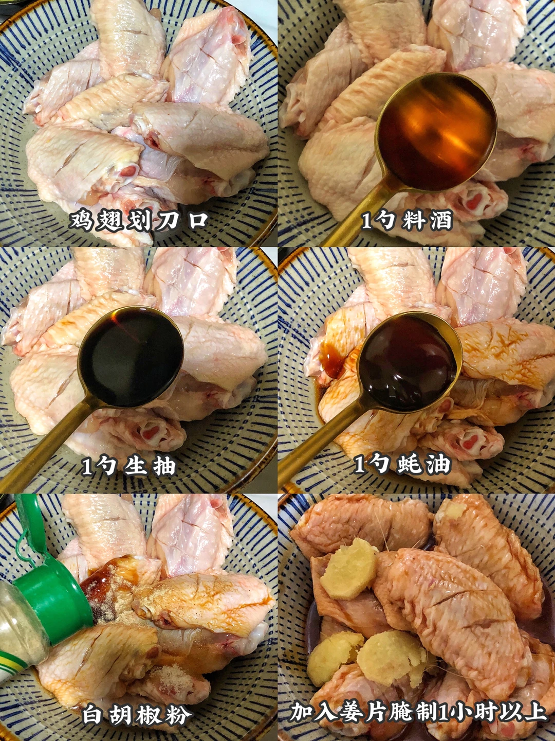 1️⃣鸡翅划刀口加入1勺生抽 1勺料酒 白胡椒粉 1勺蚝油加入姜片抓匀腌制1小时以上