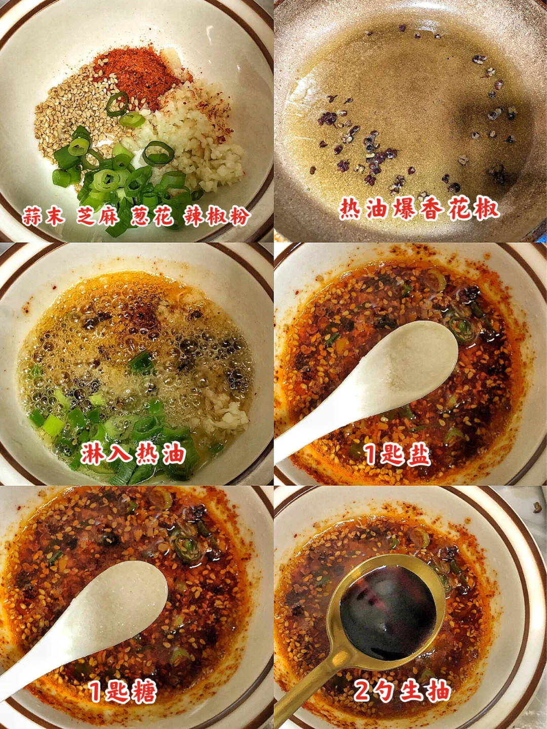 1️⃣碗里放入蒜泥 葱花 芝麻 辣椒粉,锅里热油爆香花椒后,把油淋入碗里,加入2勺生抽 1匙盐 1匙糖和1勺麻酱,加3勺温水搅拌均匀到麻酱浓稠