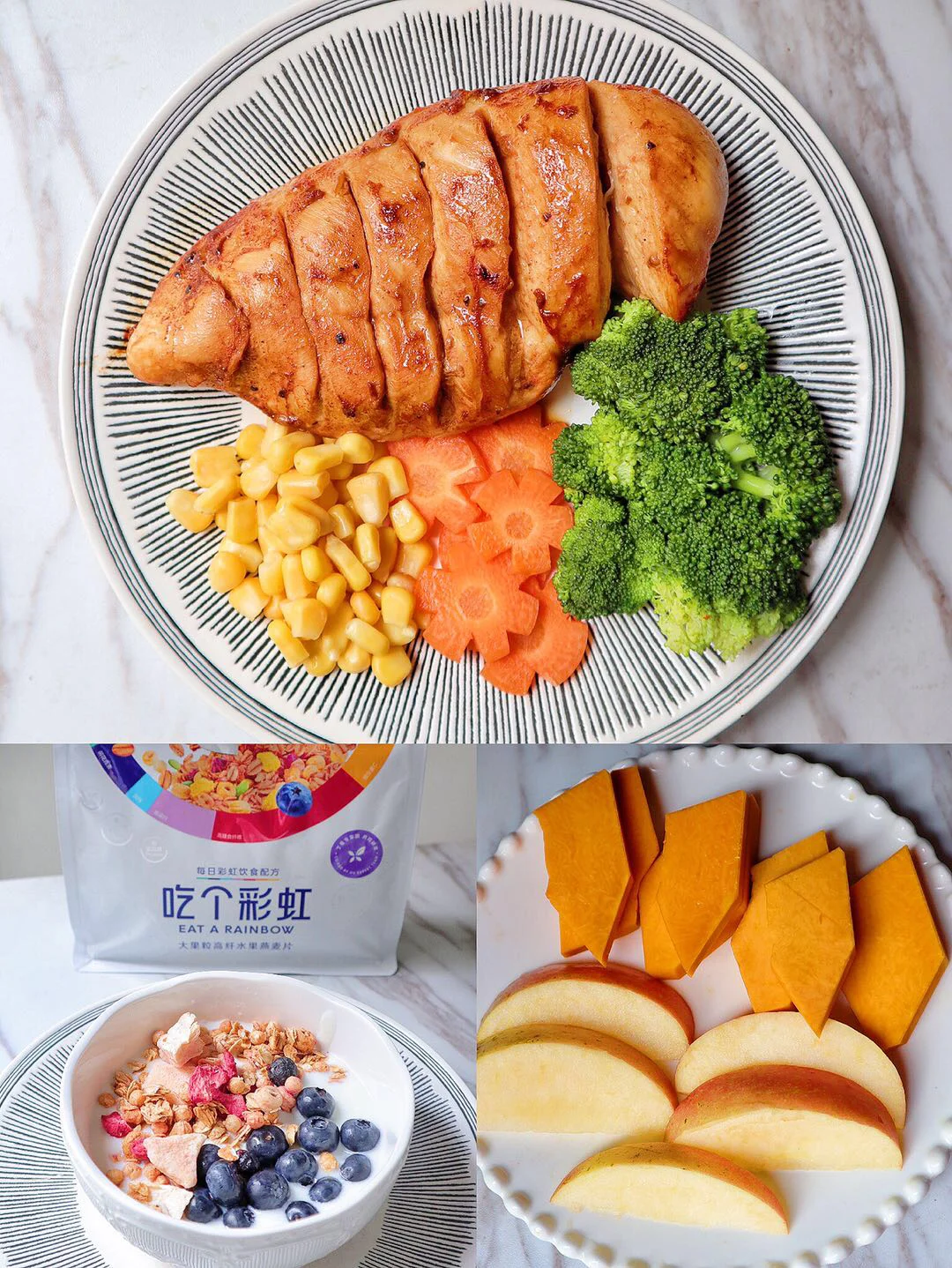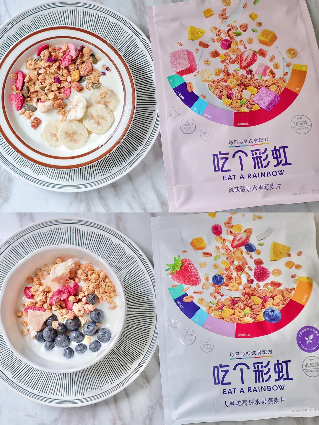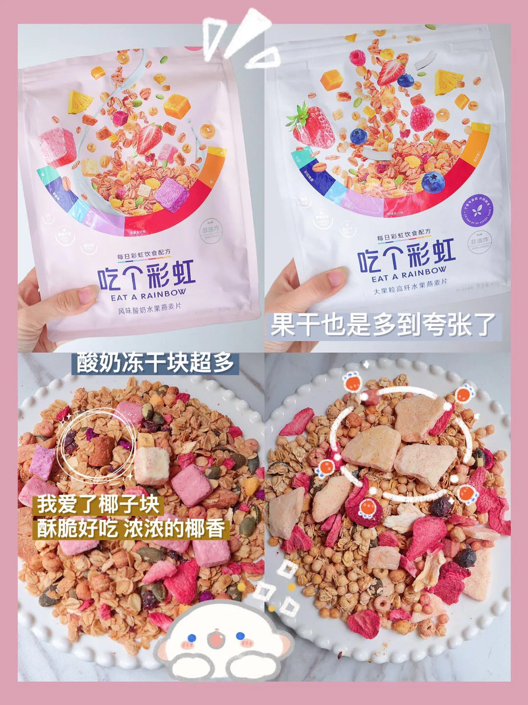 🔅tips:减脂餐的搭配原则就是:蛋白质➕主食➕VC(水果蔬菜)主食尽量不要吃米饭,玉米 紫薯 南瓜 山药 土豆 0糖麦片这种都都很🉑,我是个超爱吃麦片的人,无论是作为早餐还是主食都nice~分享下我最近发现的宝藏【吃个彩虹】水果麦片,入了无糖和酸奶水果两种口味,早上用来拌酸奶和水果🍓,中午来代替主食,因为是非油炸的还是0糖不会担心吃胖胖,果干和酸奶块多到炸啊!!口感特丰富,就算是无糖也很好吃诶~