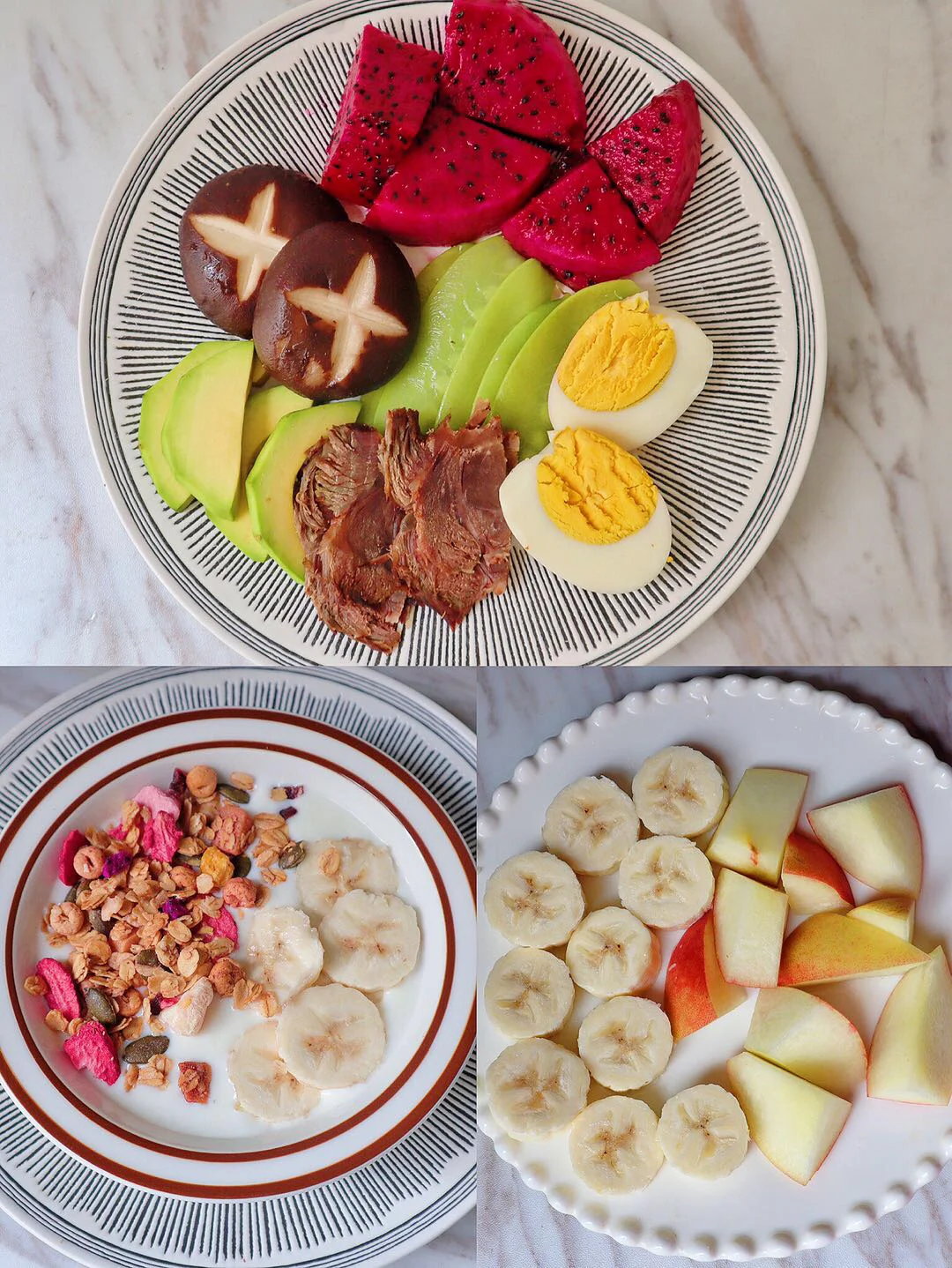 午餐:火龙果➕水煮蛋➕荷兰豆➕牛油果➕卤牛肉(卤牛肉我大部分时间会自己卤个1~2斤,放冰箱里可以吃一周,以后可以给大家发个教程,我卤的牛肉绝啦)