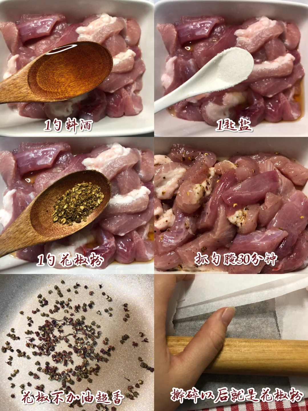 ✨花椒粉做法:热锅不放油,小火煸炒花椒粒(我放了些藤椒,喜欢麻麻的口感),炒出香味到到纸上用擀面杖擀碎