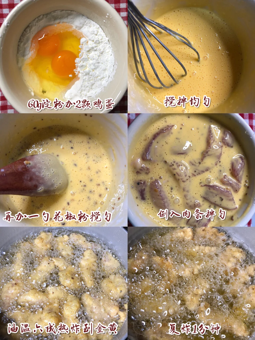❷60g淀粉加2颗鸡蛋搅拌成糊糊,然后加一大勺花椒粉调匀,然后把肉倒进去拌匀,让每条肉都裹上糊糊