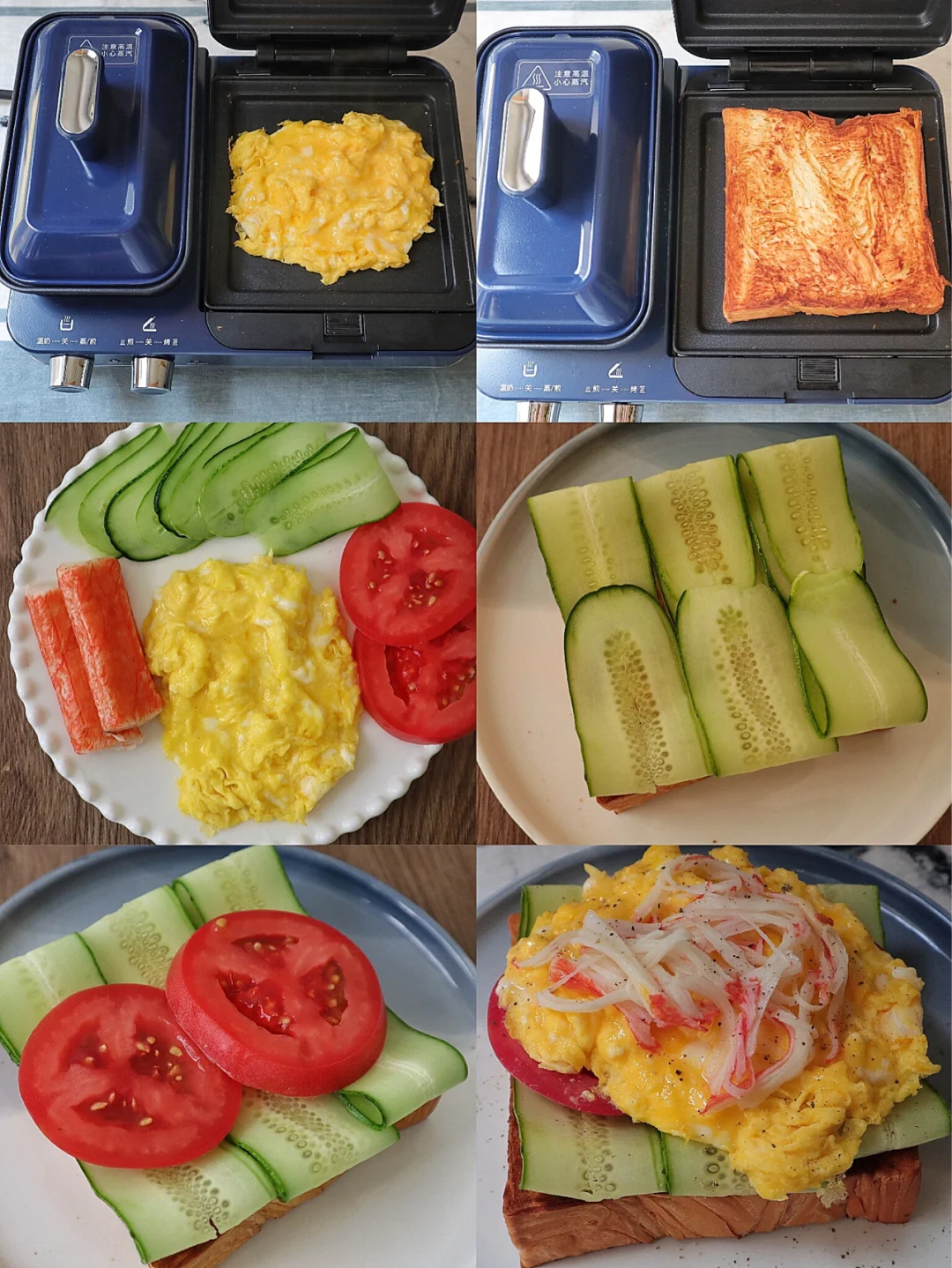 吐司铺底,抹上沙拉酱,铺一层黄瓜一层番茄一层滑蛋一层蟹柳,最后撒上黑胡椒