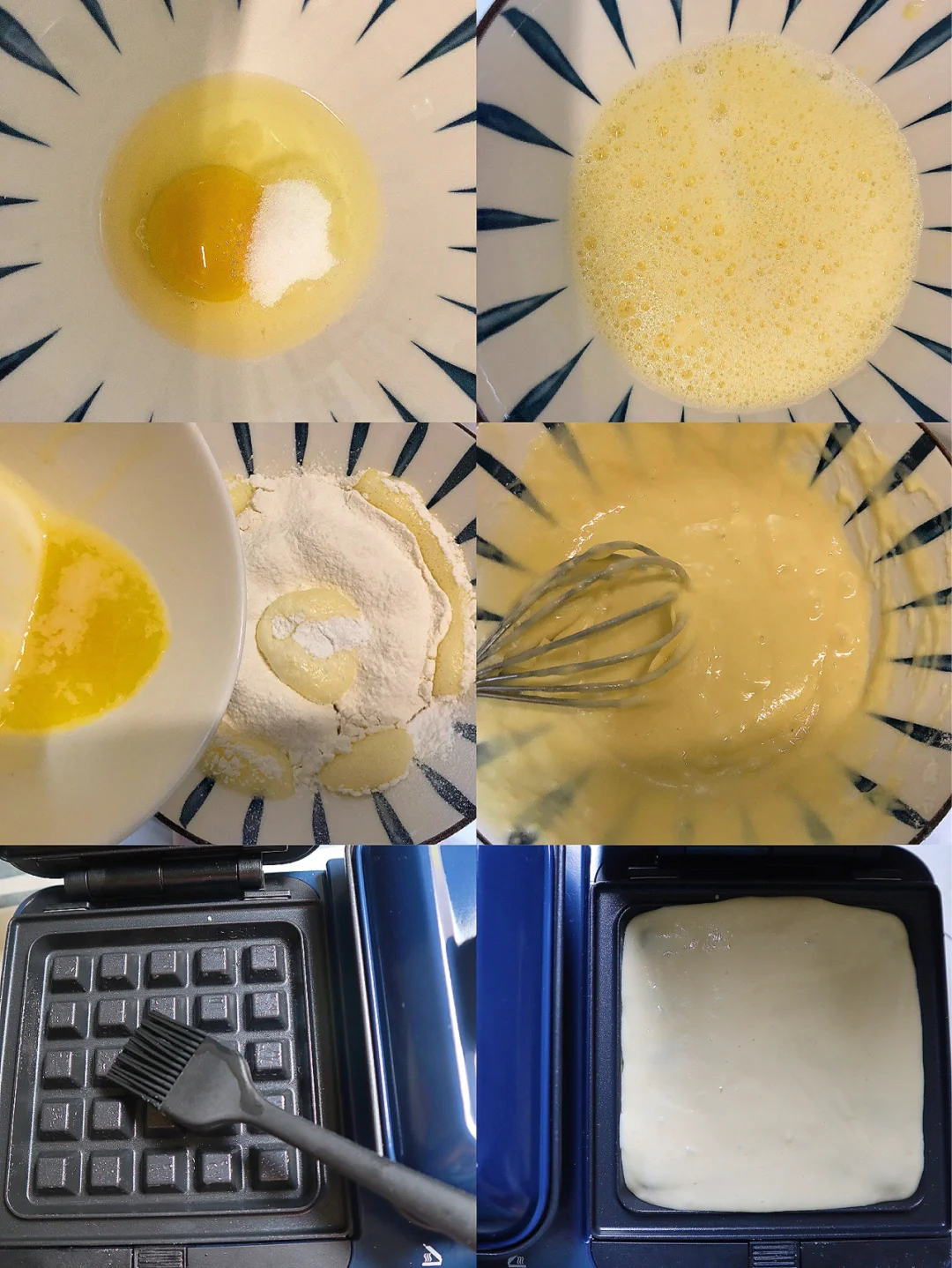 1个鸡蛋加入10-20g糖(自己调节) 30g牛奶 筛入60g低筋面粉和1g无铝泡打粉最后加入15g融化黄油搅打到五颗粒,换上华夫饼盘刷油倒入面糊盖上盖子大概7~8分钟不冒气的时候就好啦~外壳酥酥脆脆的,里面软夫夫的超好吃~🥳