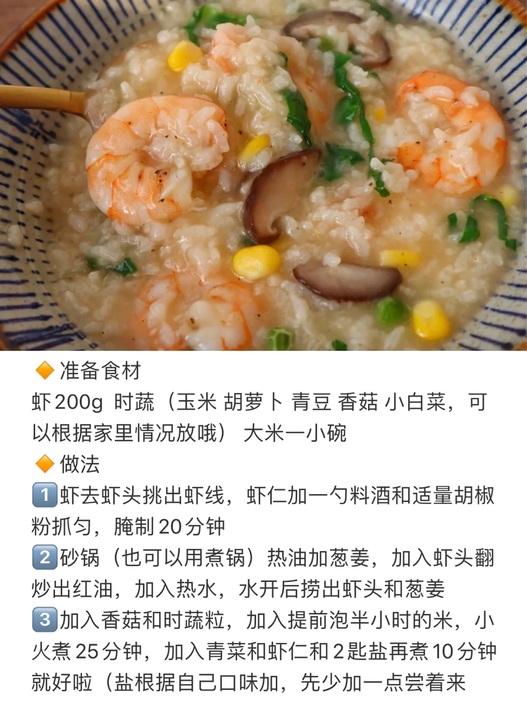 满满的虾仁和时蔬,早上一碗下肚营养全都有啦,我就喜欢这种咸口的粥,喝下去暖呼呼的~