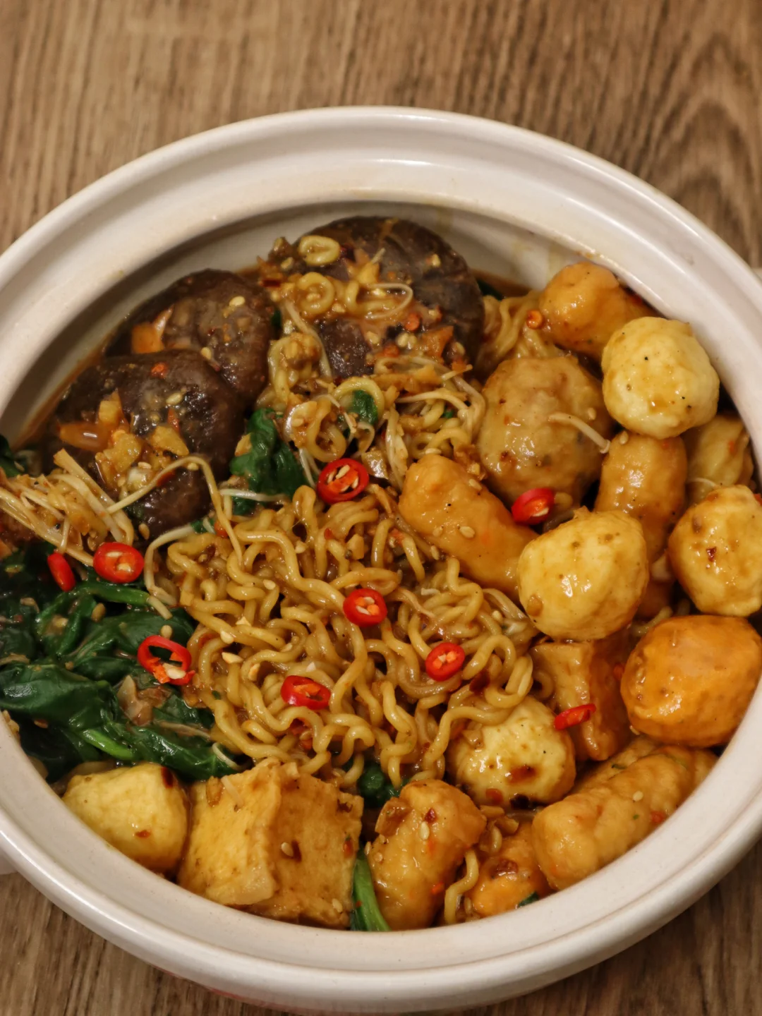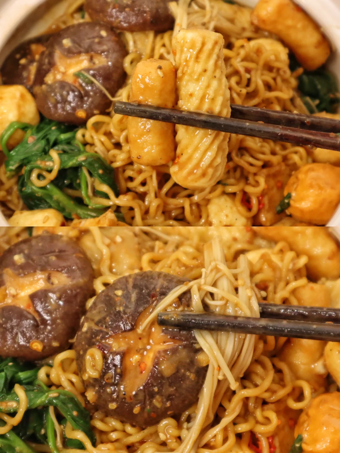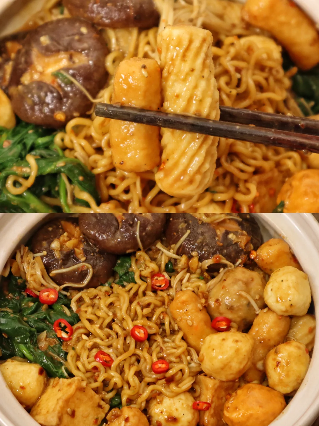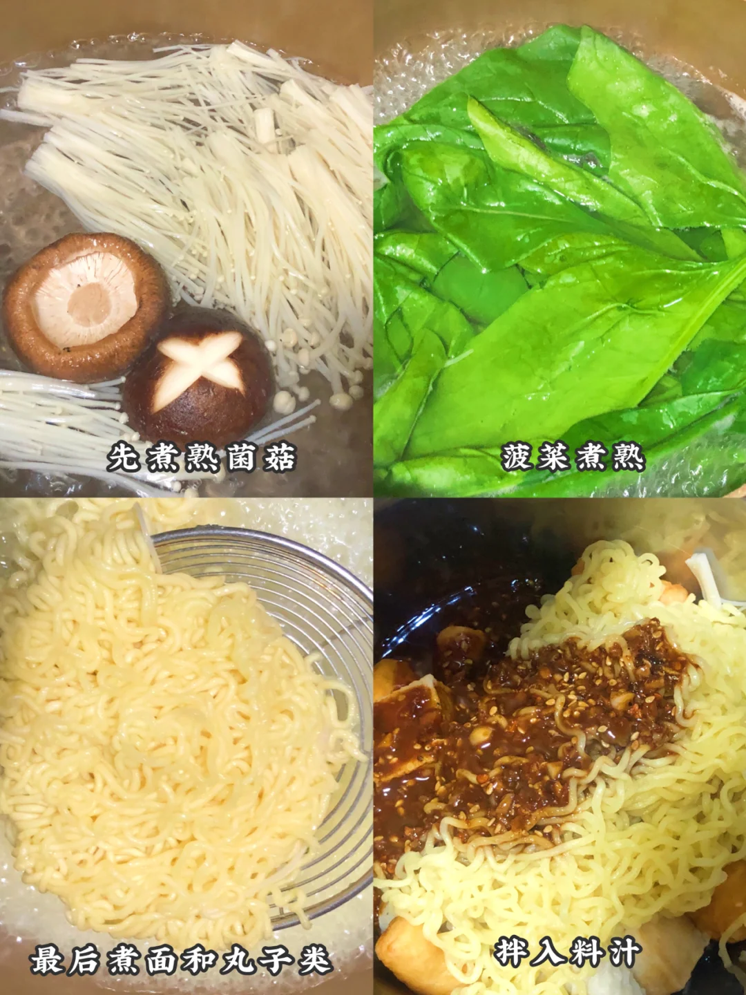 2️⃣把菌菇 蔬菜 丸子 泡面饼依次煮熟捞出控水