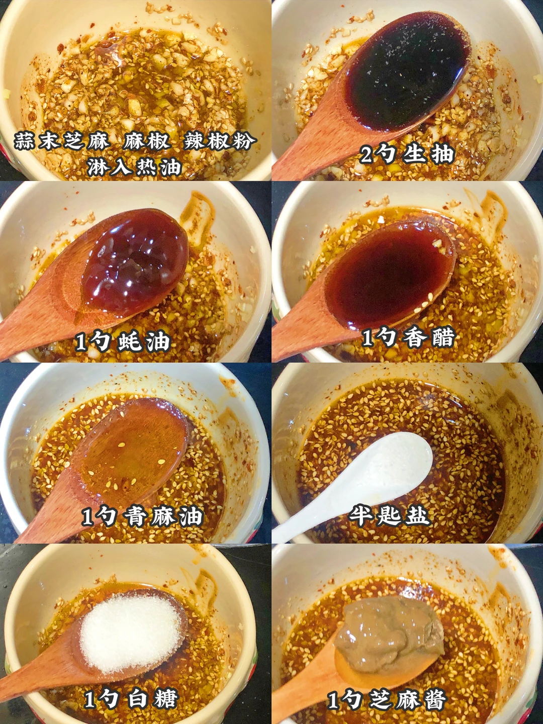 1️⃣调料汁:蒜末 芝麻 辣椒粉 麻椒粉淋入热油,加入2勺生抽 2勺醋 1勺蚝油 1勺麻椒油 1勺白糖和半匙盐 最后加入1大勺麻酱搅拌均匀就好啦