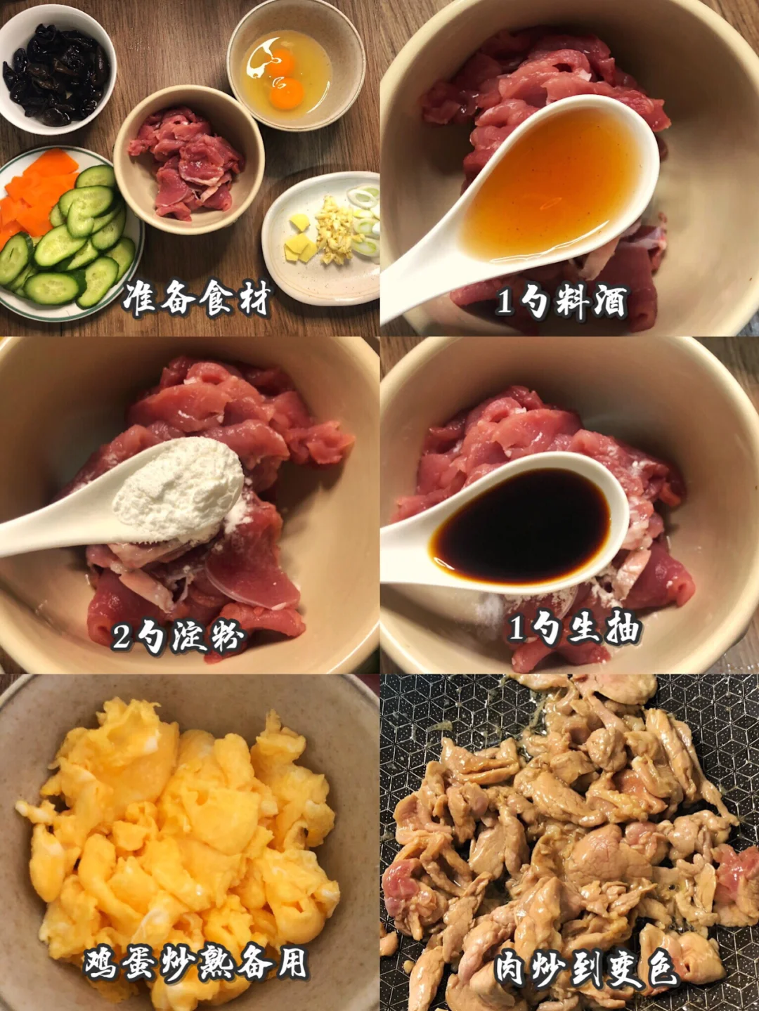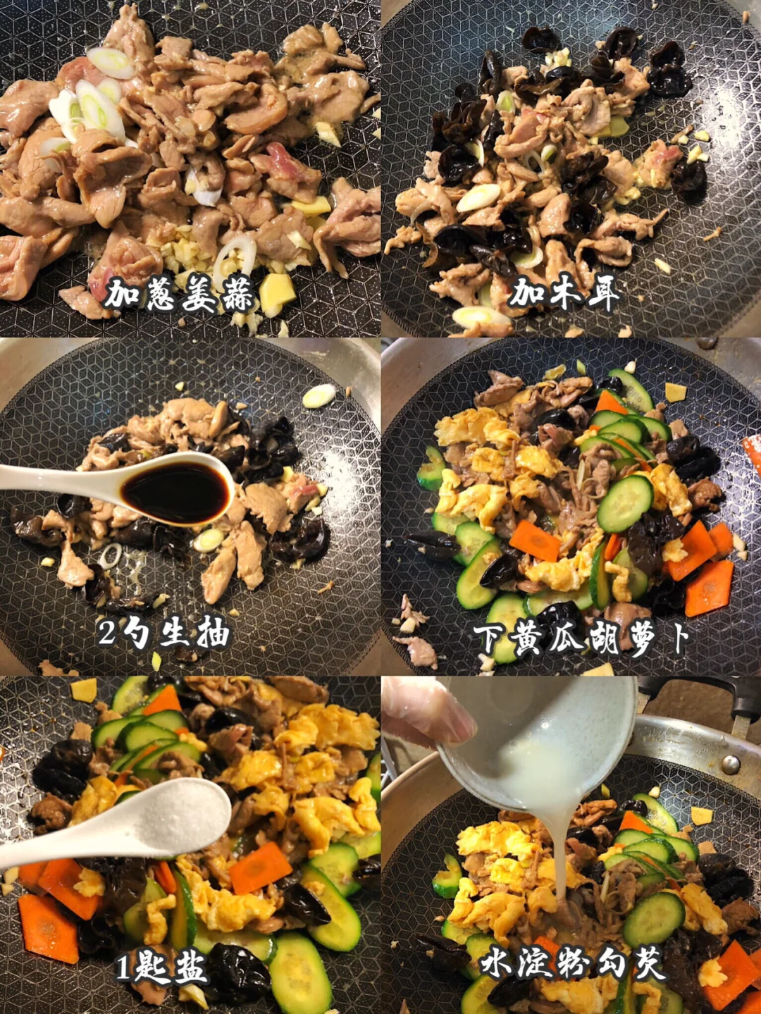 3️⃣锅里热油下入肉片滑熟,然后加入葱姜蒜再加木耳翻炒,加入两勺生抽,然后加黄瓜和胡萝卜片
