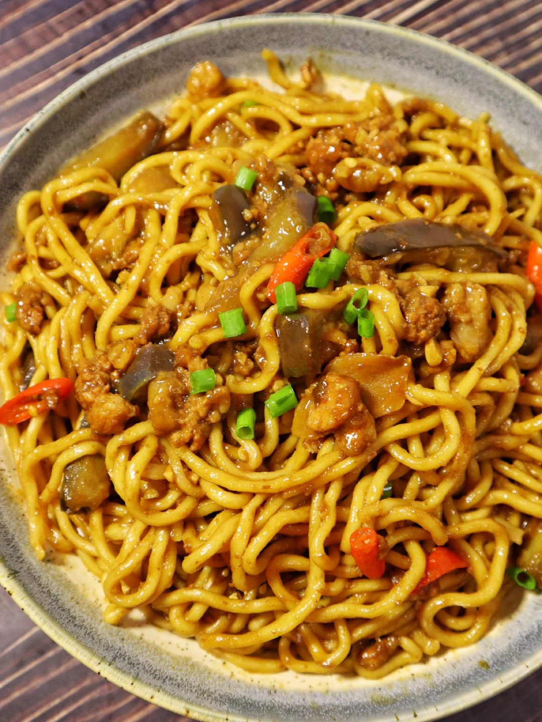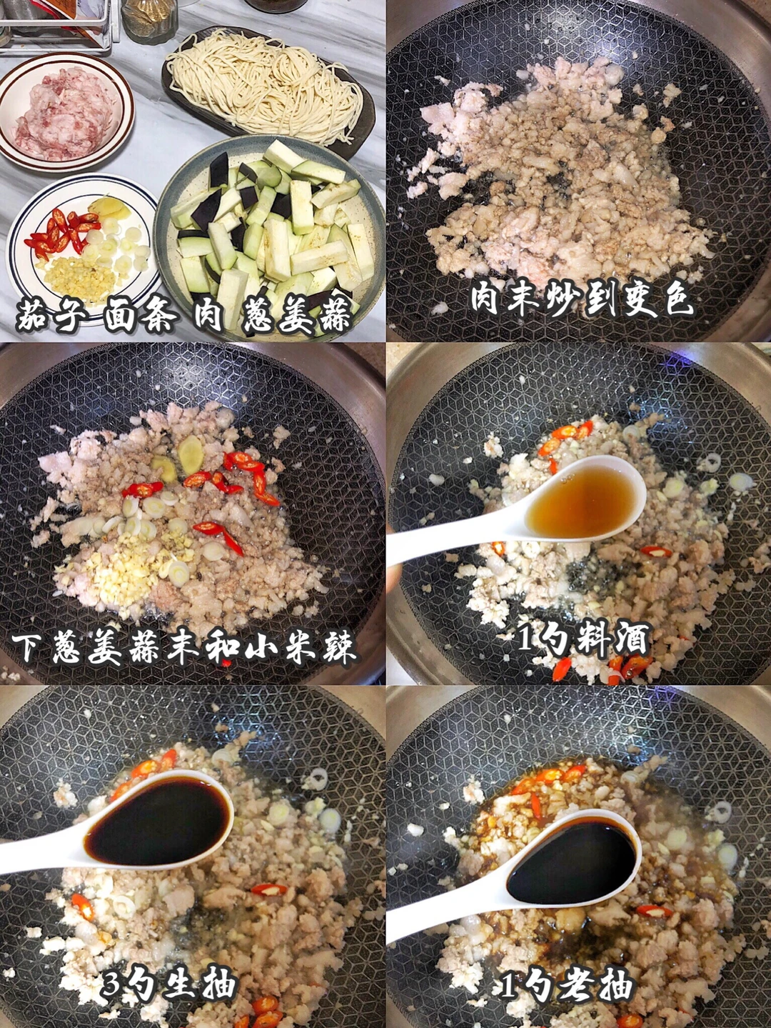2️⃣锅里热油把肉末炒到变色,然后加入葱姜蒜和小米辣,加入一勺料酒,三勺生抽,一勺老抽和一勺蚝油,翻炒均匀以后下入茄子(勺子是平时吃馄饨的勺子)