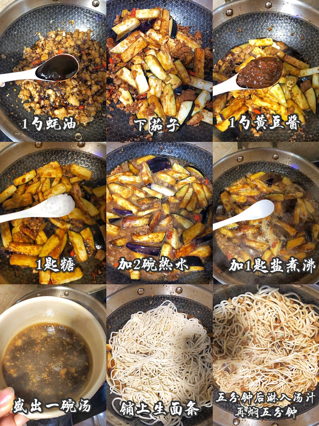 4️⃣把汤煮沸以后盛出一碗来备用,然后把生面条铺在茄子上面,盖上锅盖小火焖五分钟,然后最后把汤汁淋在面条上,盖上盖子再焖五分钟,开盖以后搅拌均匀收汁就可以吃了