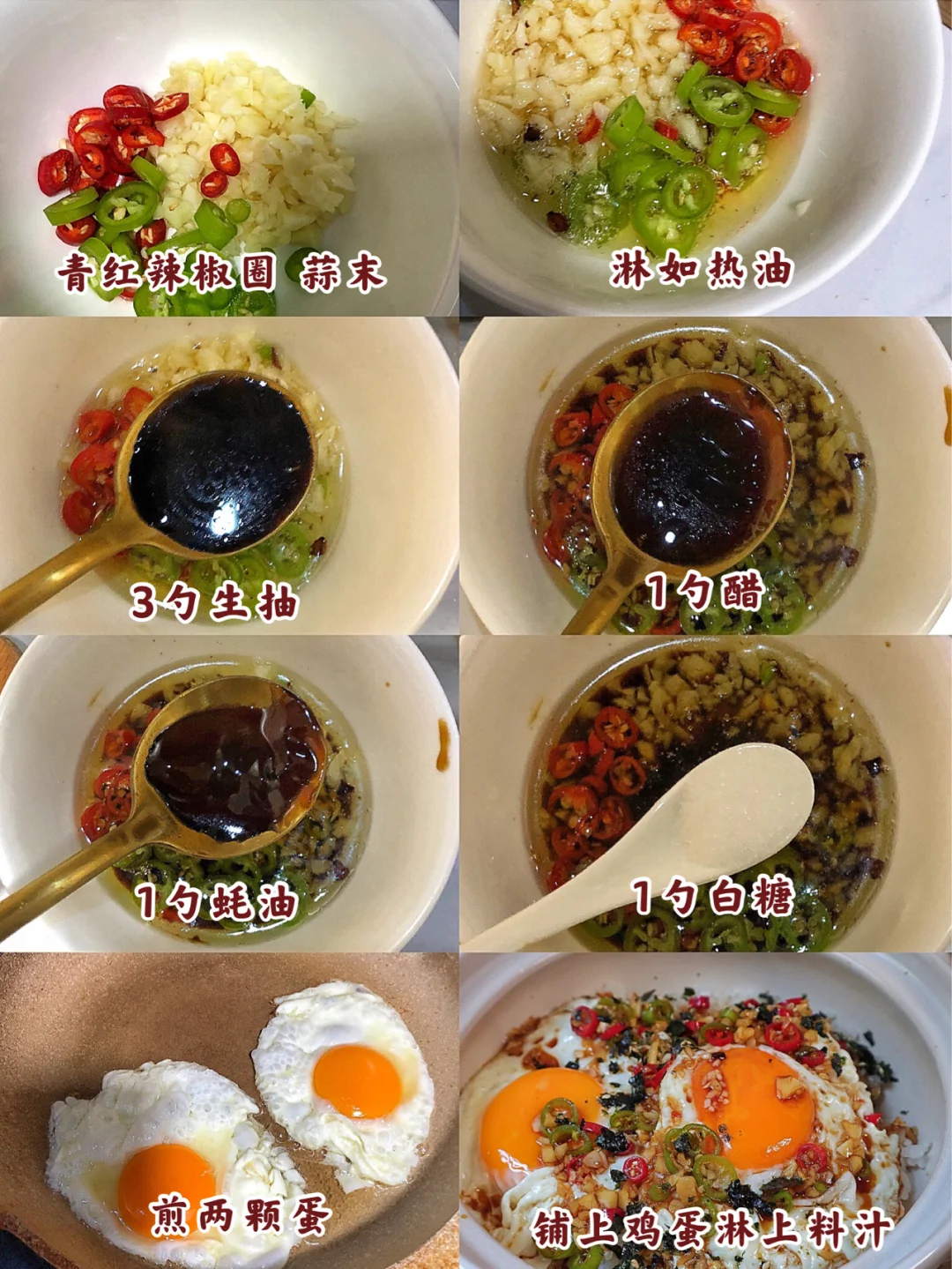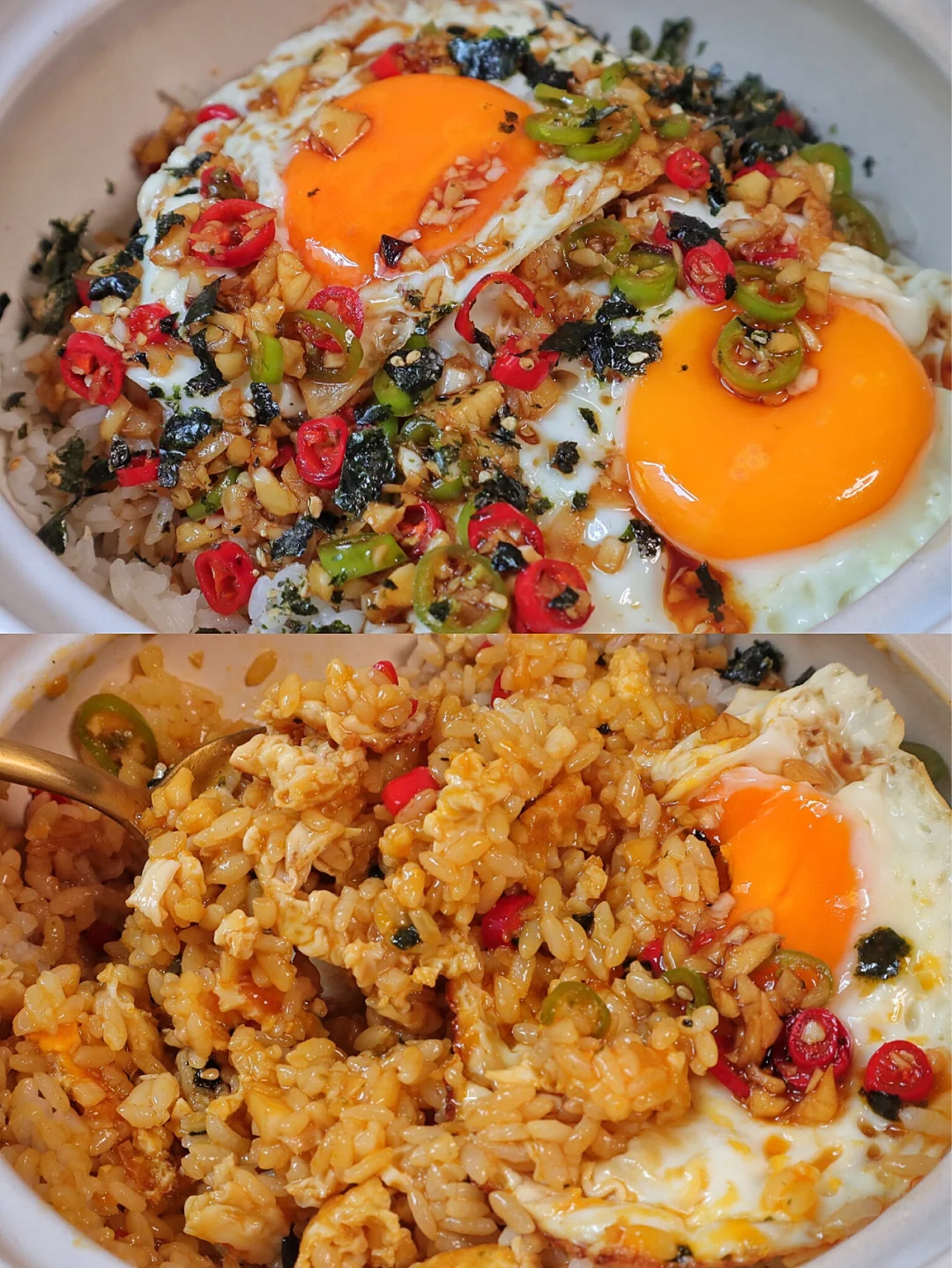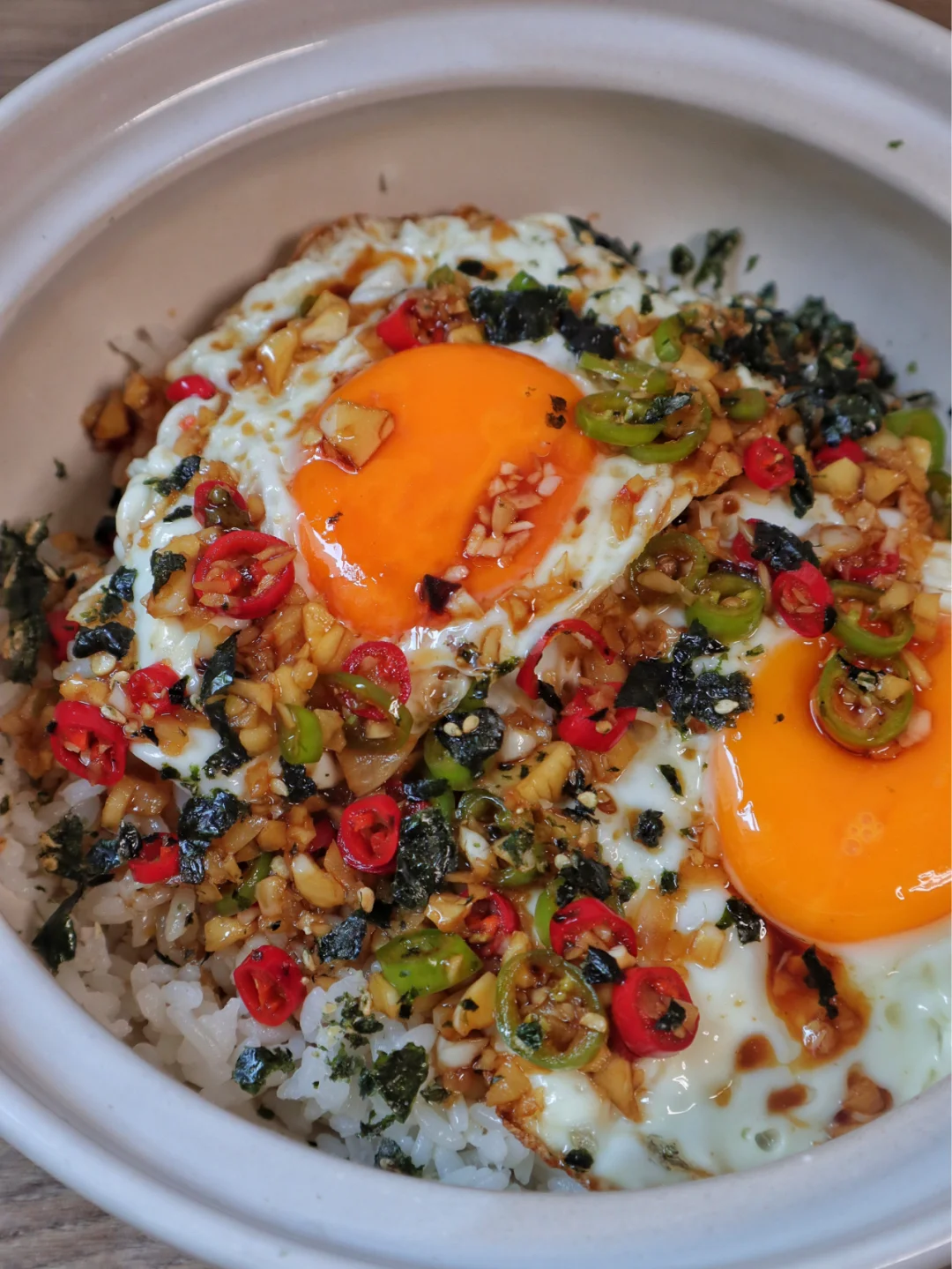 3️⃣鸡蛋盖在热腾腾的米饭上,淋上酱料,撒上芝麻和海苔碎(没有也可以),搬运开吃~