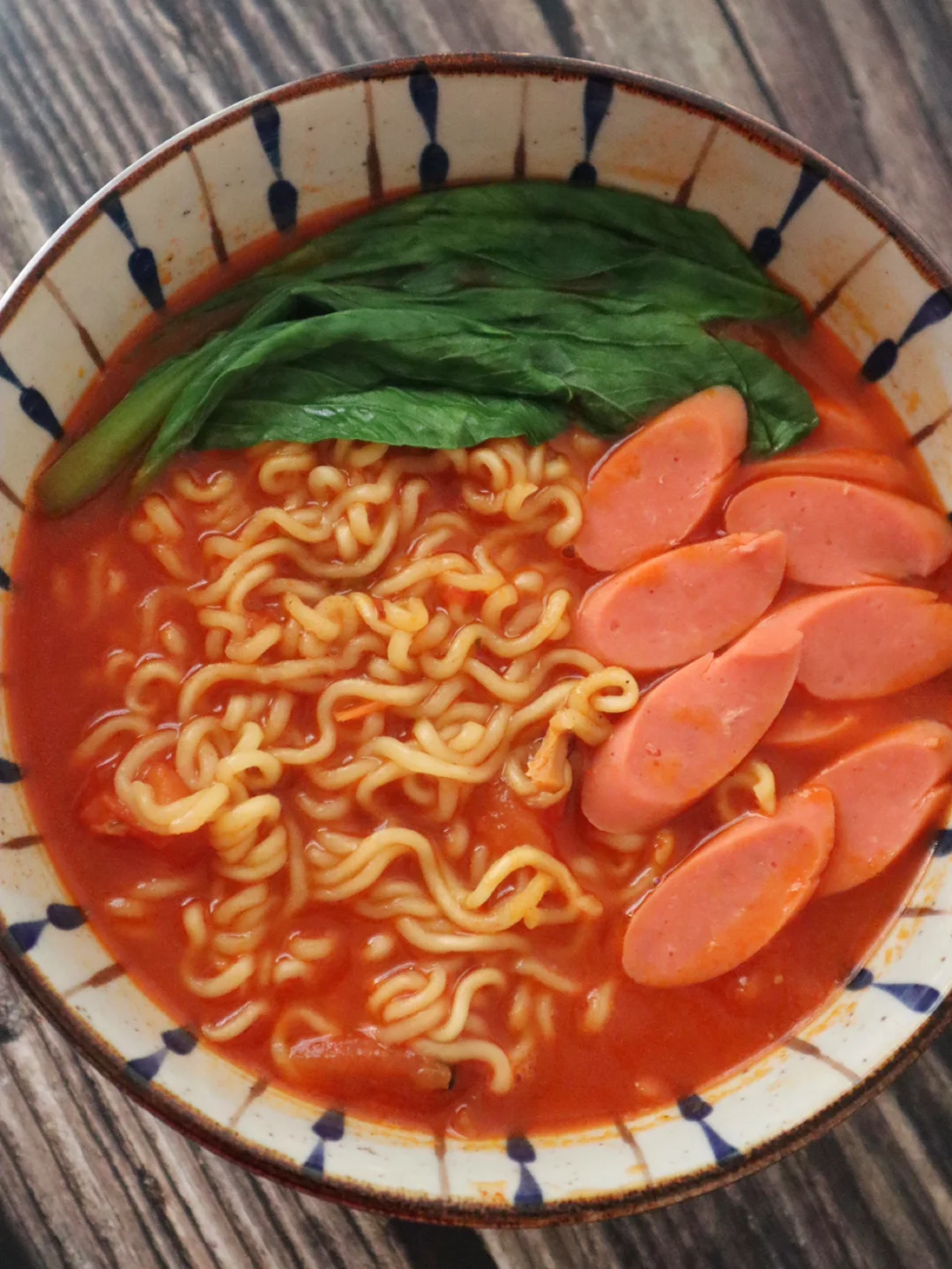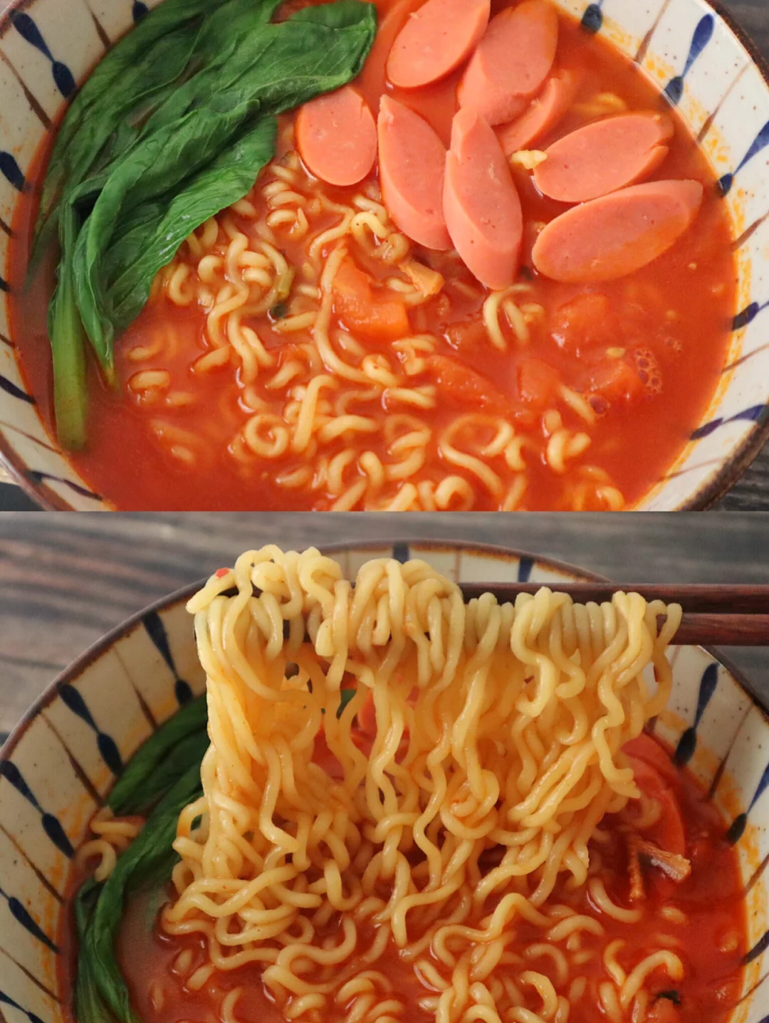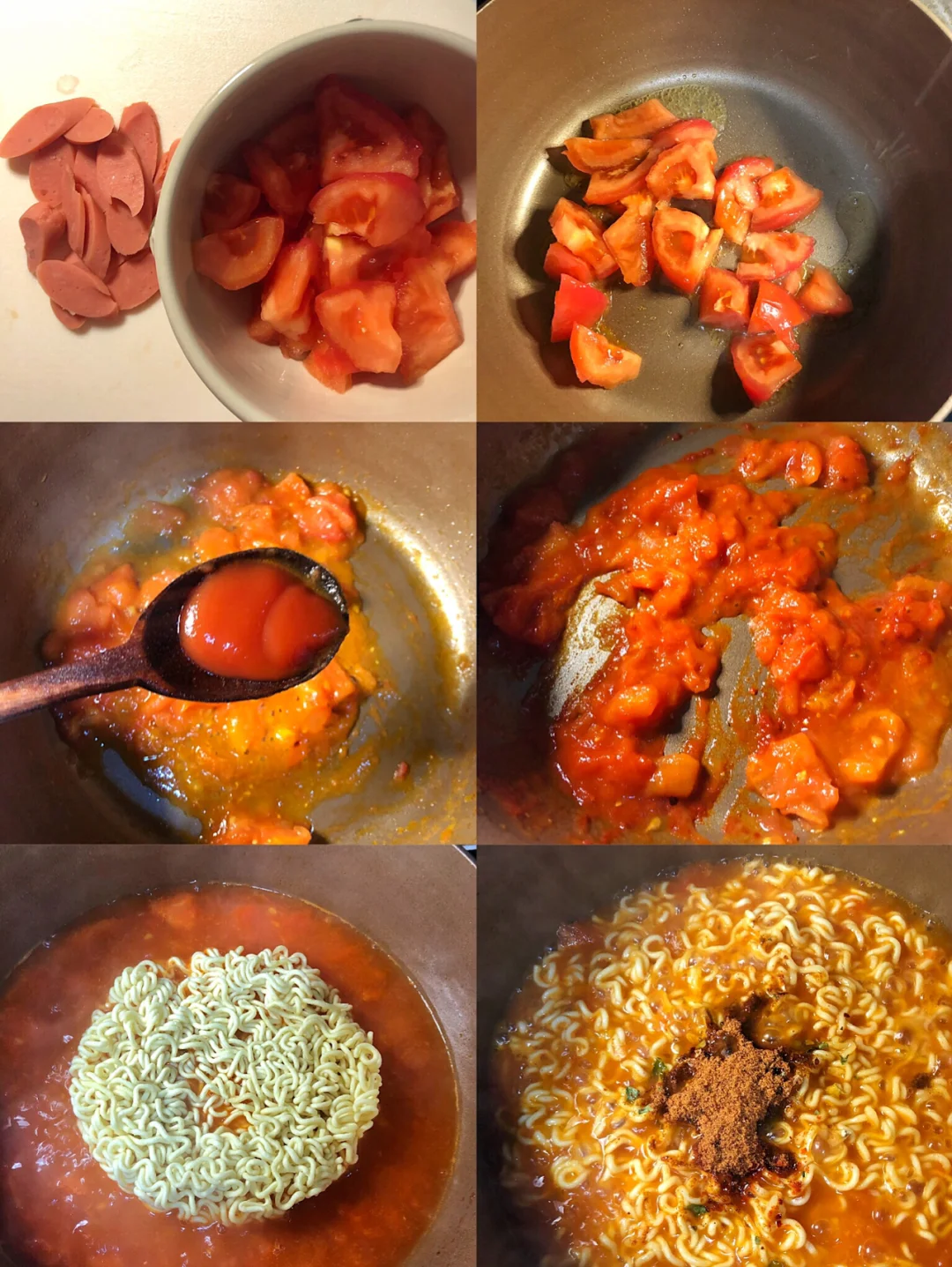 2️⃣锅里开小火煸炒番茄块,炒到软烂出汁,加一勺番茄酱炒匀,加1碗水,水开后下泡面和料包,最后放一点青菜,出锅后铺上火腿片