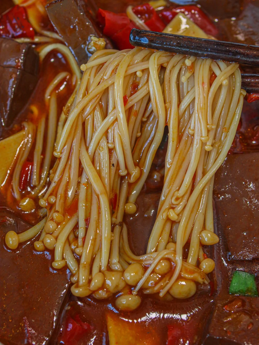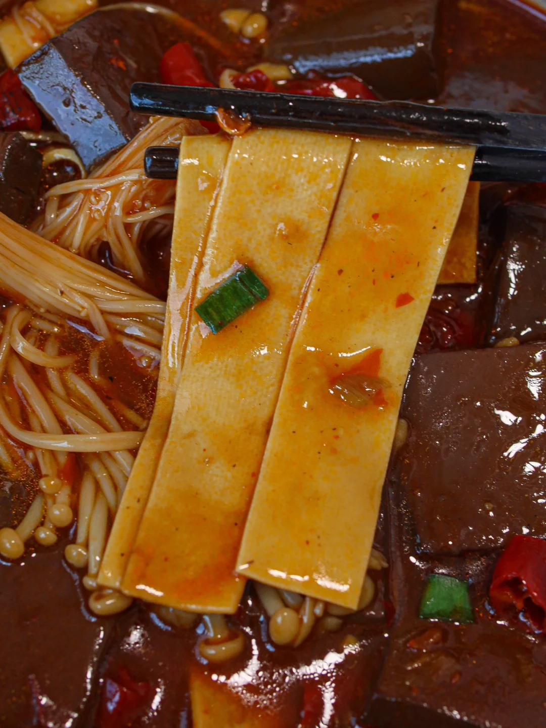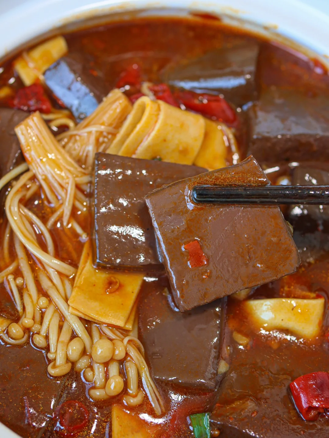 😋鸭血嫩嫩的,豆片和金针菇已经很入味了~真滴好吃!