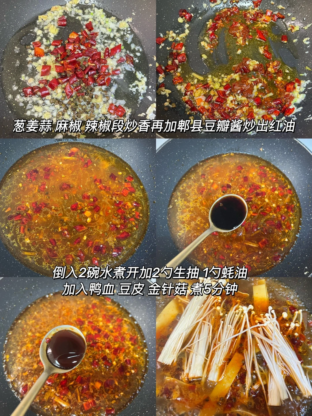 1️⃣炒香葱姜蒜末后加1大勺郫县豆瓣酱炒出红油,然后加水煮沸,加2勺生抽 1勺蚝油调味,如果汤淡可以再加一些盐