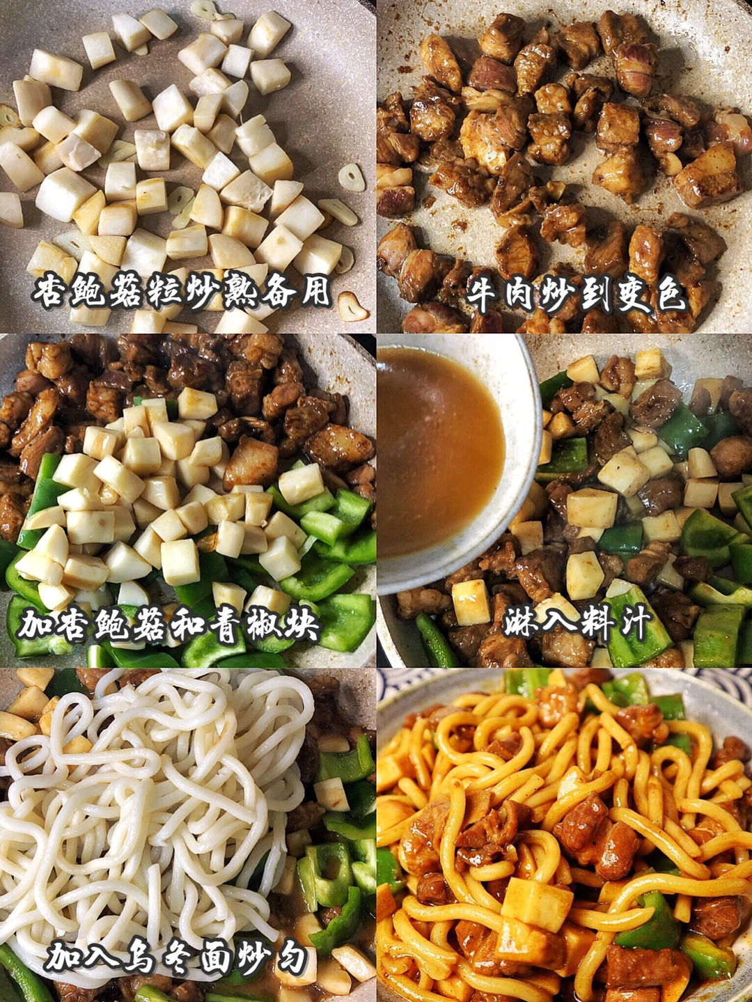 3️⃣杏鲍菇炒熟盛出备用,牛肉炒到变色以后加入杏鲍菇和青椒块,然后淋入料汁,最后加入乌冬面翻炒均匀