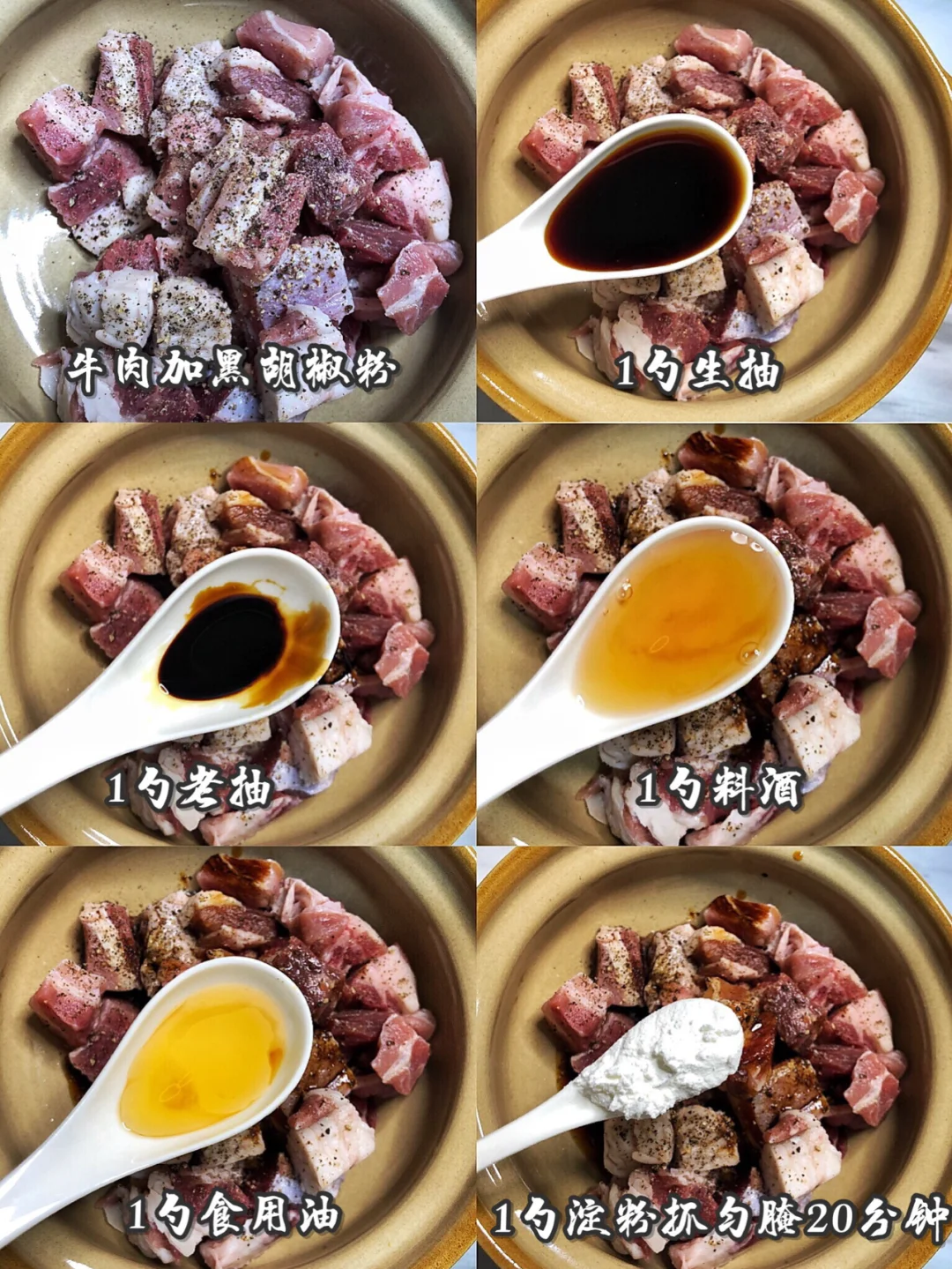 2️⃣调碗汁:一勺淀粉 一勺蚝油 一勺黑胡椒酱(没有用黑胡椒粉)加半碗水搅拌均匀
