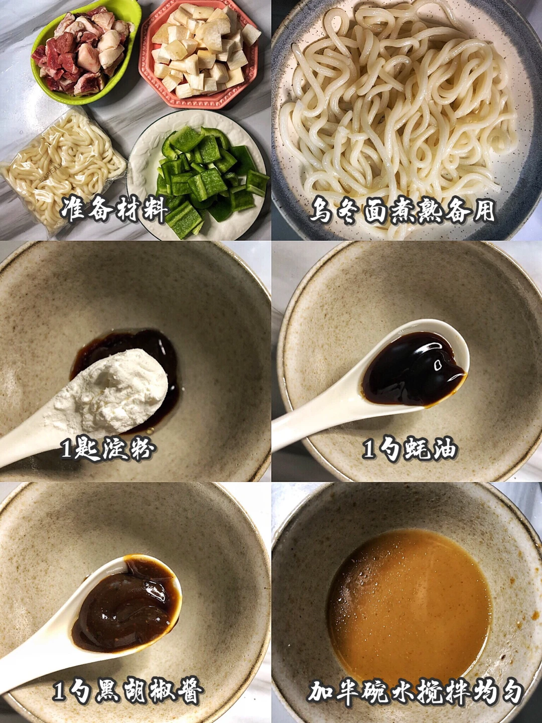 1️⃣牛肉切块,青椒切块,杏鲍菇切丁,牛肉加一勺生抽,一勺老抽,一勺料酒,一勺食用油和一勺淀粉抓匀腌制20分钟,乌冬面煮熟捞出拌一点油放粘连