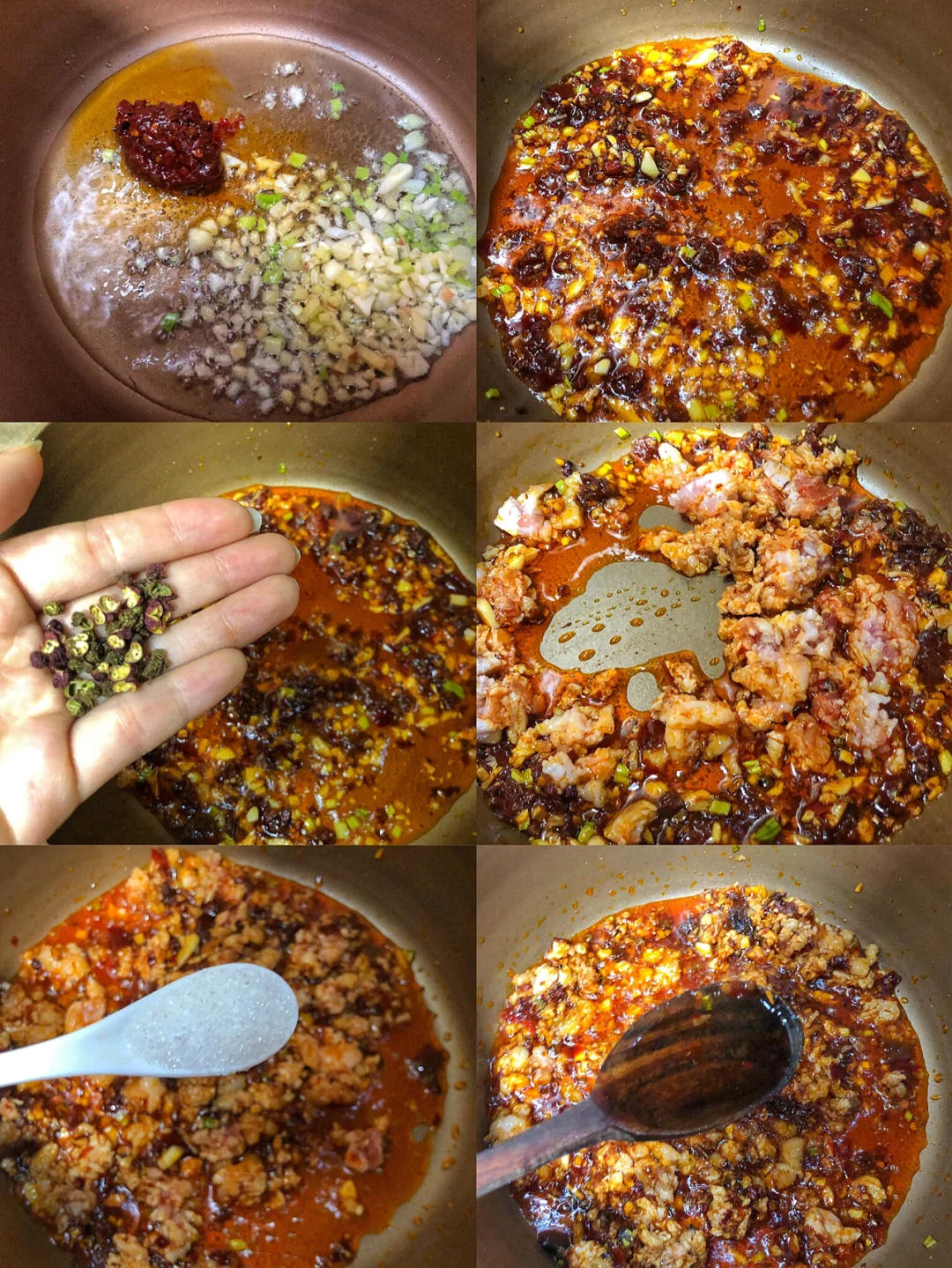 2️⃣锅里热油爆香葱姜蒜末,然后加入2勺豆瓣酱小火炒出红油,加入花椒和麻椒粒(喜欢吃辣的再放一些干辣椒哦)
