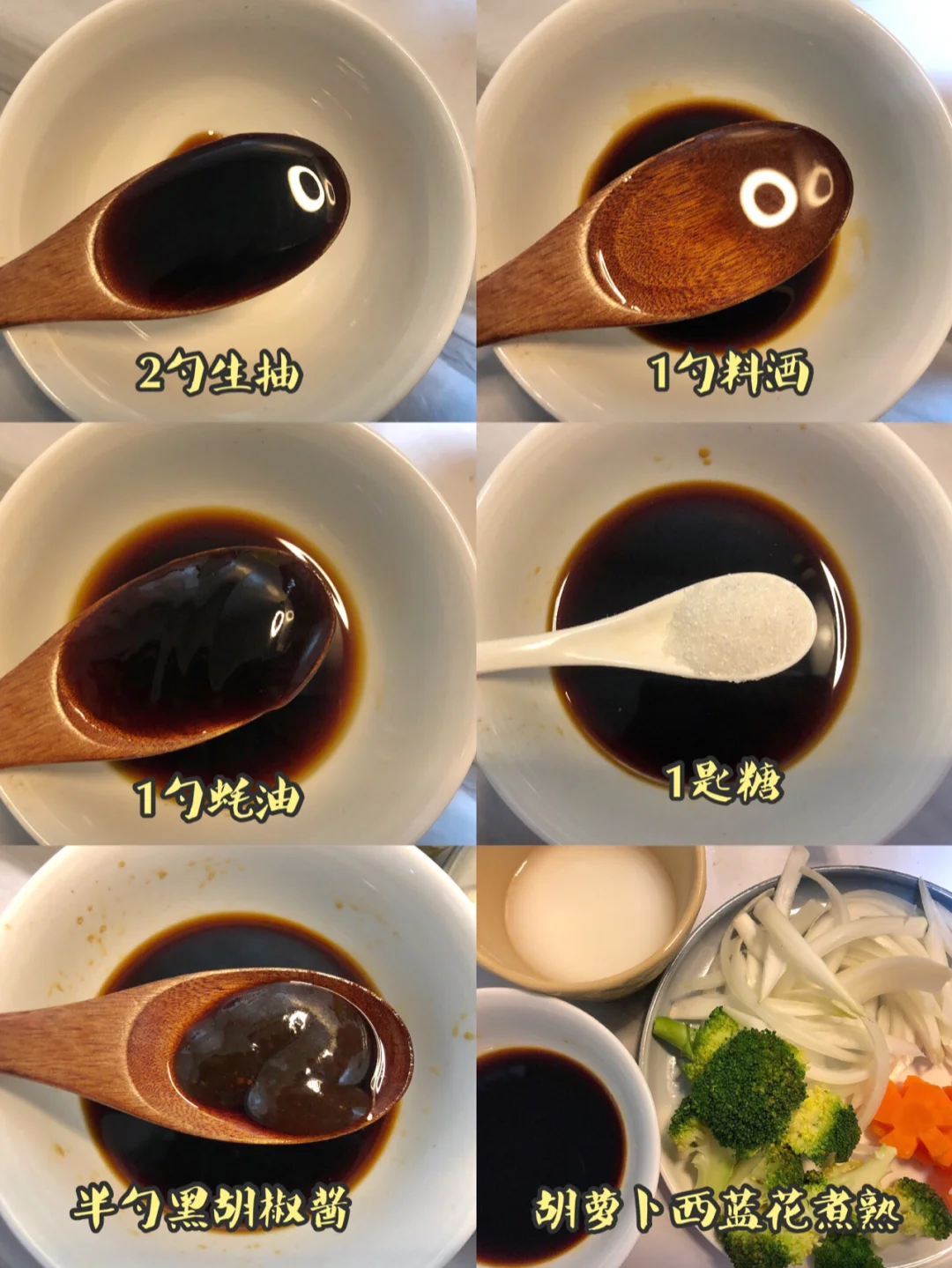 1️⃣调料汁:2勺生抽 1勺料酒 1勺蚝油 1匙糖 半勺黑胡椒酱(可换成黑胡椒粉)搅匀备用,再调小半碗水淀粉