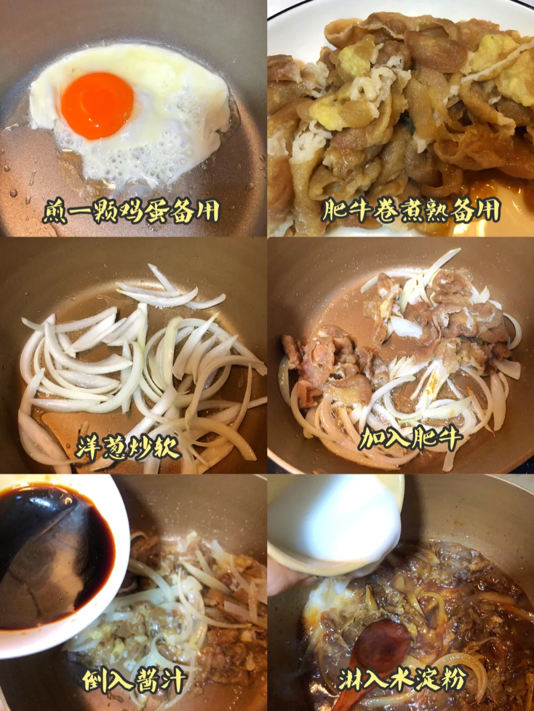 3️⃣锅里热油爆香洋葱,把洋葱炒的软软的下肥牛,然后淋入料汁,煮2分钟加水淀粉收汁