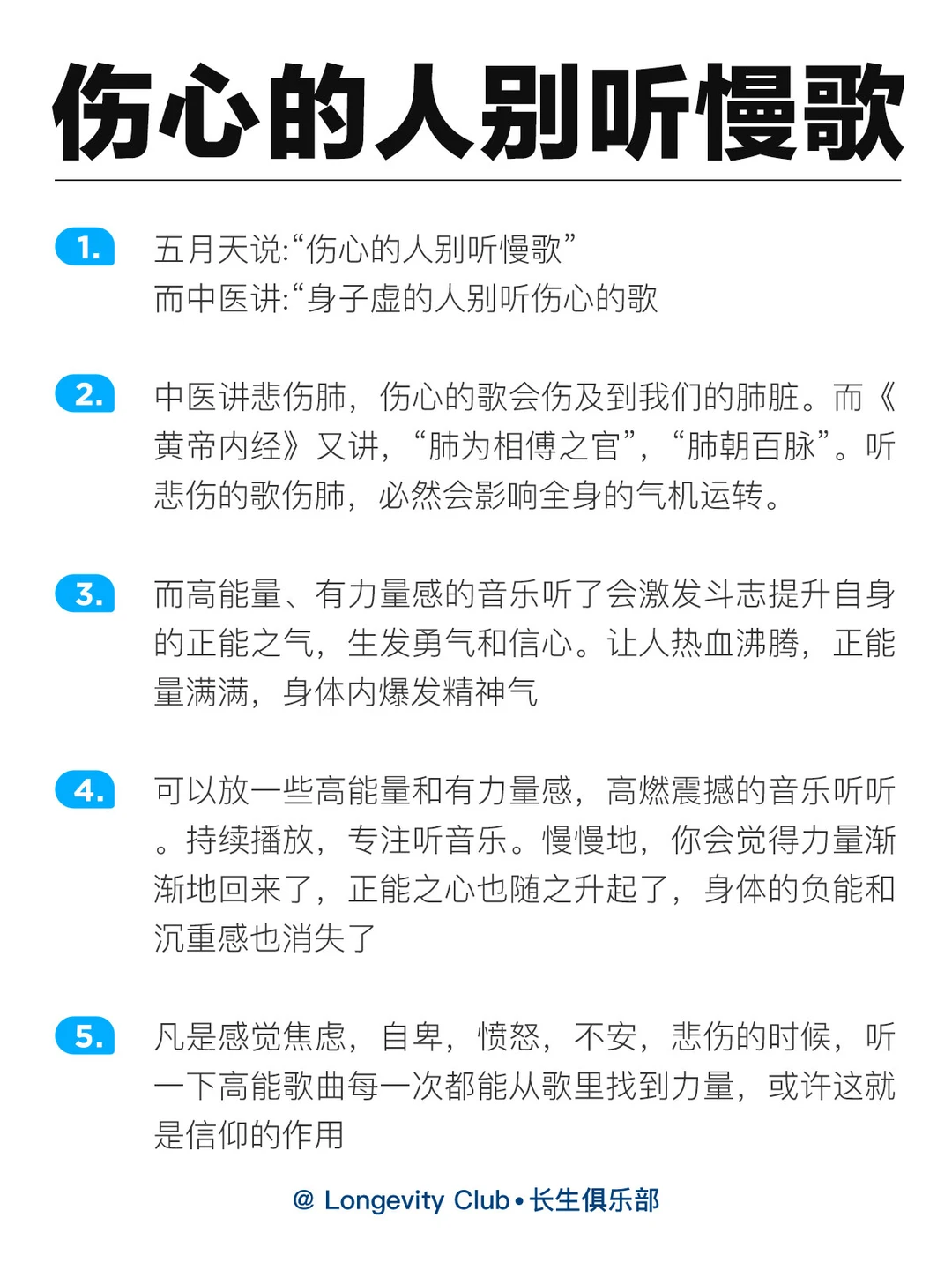 中医讲悲伤肺,伤心的歌会伤及到我们的肺脏。而《黄帝内经》又讲,“肺为相傅之官”,“肺朝百脉”。听悲伤的歌伤肺,必然会影响全身的气机运转。
