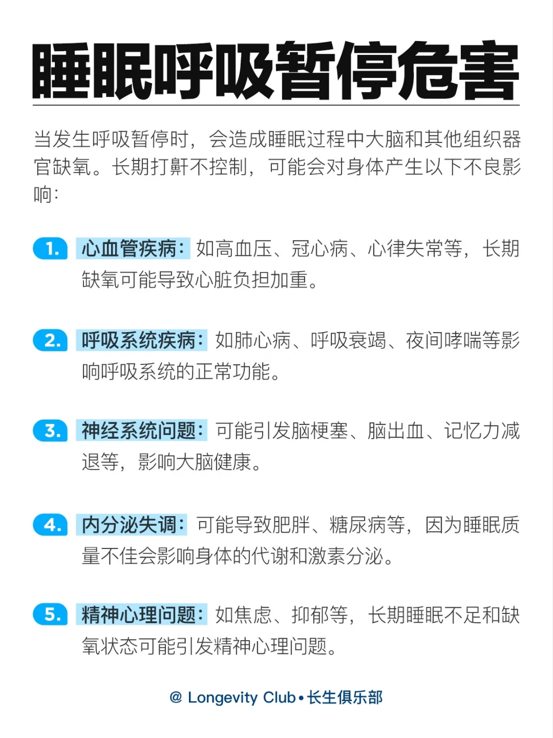 当发生呼吸暂停时,会造成睡眠过程中大脑和其他组织器官缺氧。长期打鼾不控制,可能会对身体产生以下不良影响: