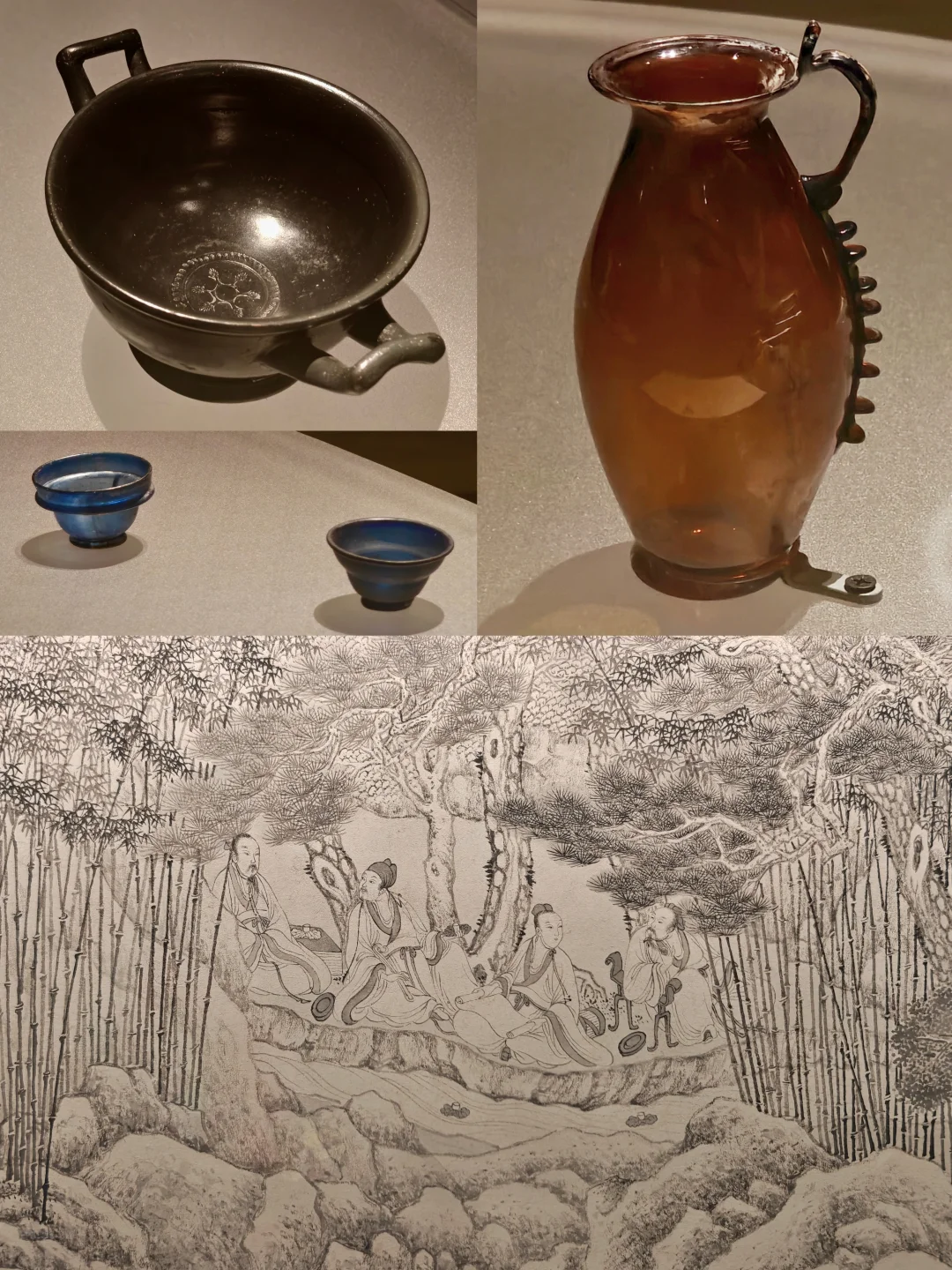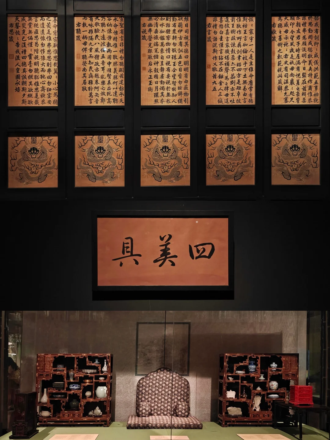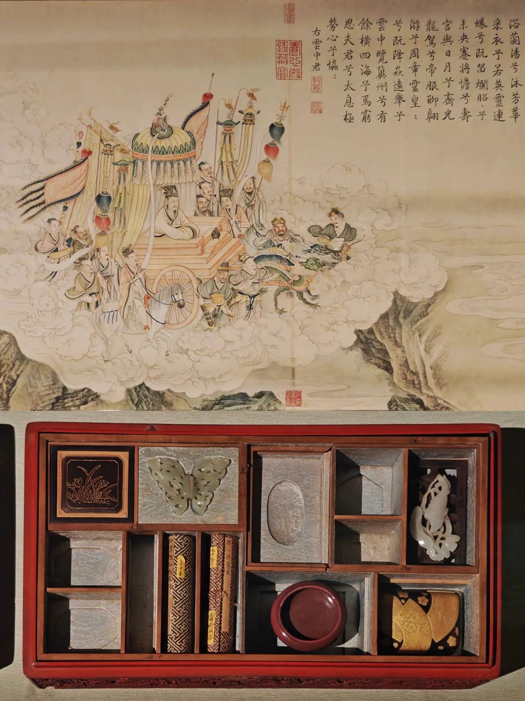 ⚱️四美具:乾隆于建福宫花园静怡轩中珍藏顾恺之·女史箴图和传为宋李公麟的潇湘卧游图、蜀川胜概图、九歌图这四件名品。展览用数十件瓷器、玉器、珐琅等,加上宝座床与博古柜,对四美具空间复原与重构;展出乾隆临的女史箴图与宫廷画师临的九歌图卷