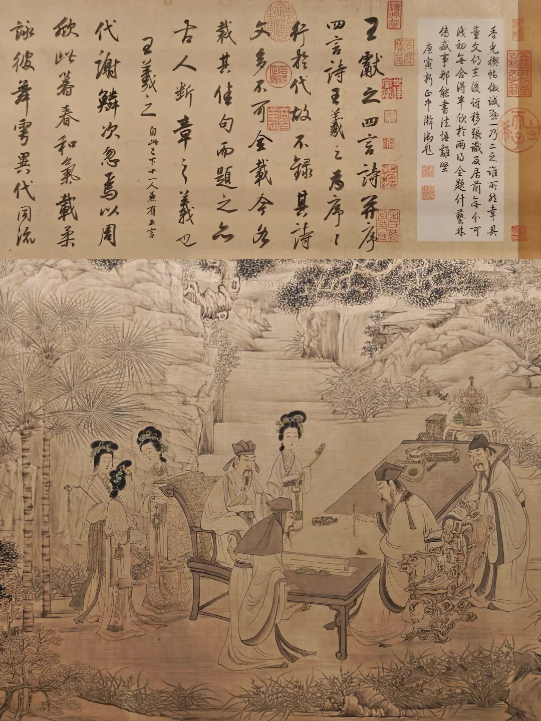📜兰亭雅集的不同版本的字帖、诗卷以及画作:尤求·修褉图集,董其昌·临柳兰亭诗卷,清·兰亭八柱帖