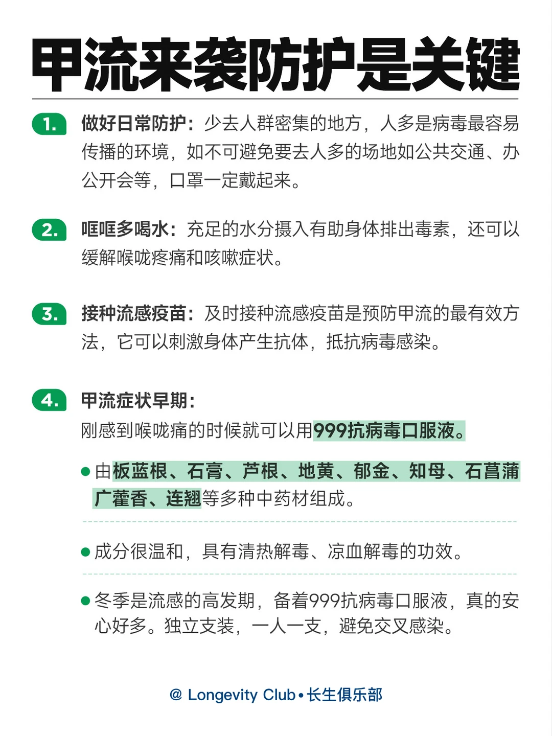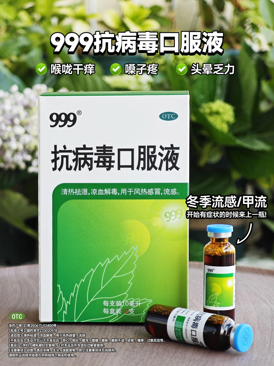 4.甲流症状早期:刚感到喉咙痛的时候就可以用999抗病毒口服液,帮助压制。