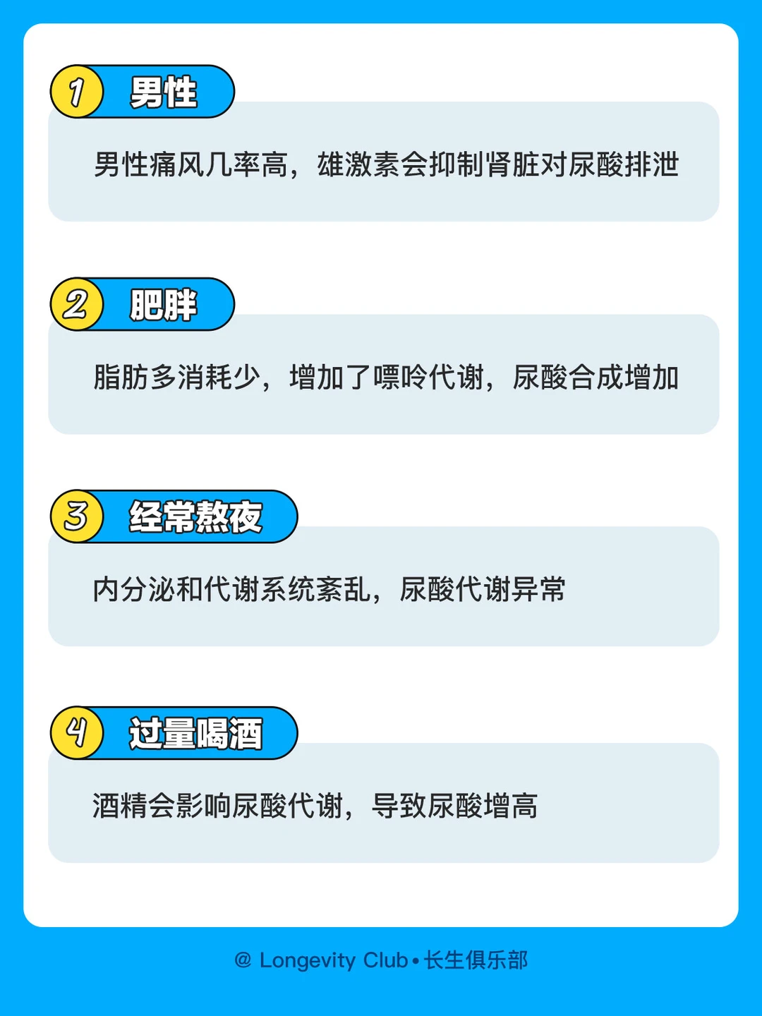 tong风的原因是”高尿酸”,尿酸异常升高导致痛风,引起关节肿痛,长痛风石,最终导致关节变形。频频发作十分折磨人!尿酸是嘌呤代谢的终产物,经常喝啤酒、吃海鲜,又不爱运动,日常饮水量不足的人群更容易中招!