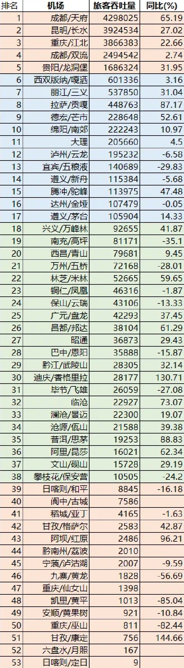 昆明长水则反超重庆江北机场位居第二。