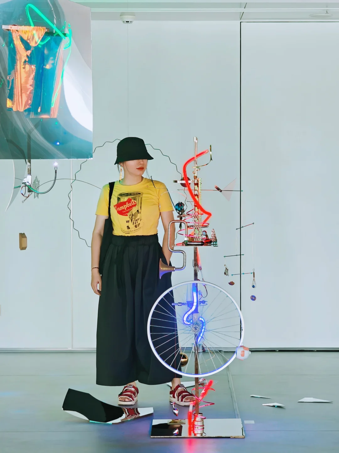 创作不追求控制感而重随机感,主张媒材“祛魅化”。《Over the Rainbow》以玻璃微珠、铝塑板等为材料,基于笛卡尔光学原理与数学模型构建动态彩虹;《想做点什么而又什么都不想做》是机电装置,通过吐烟圈营造松弛游离的状态,映射人们在现实压力下的挣扎。