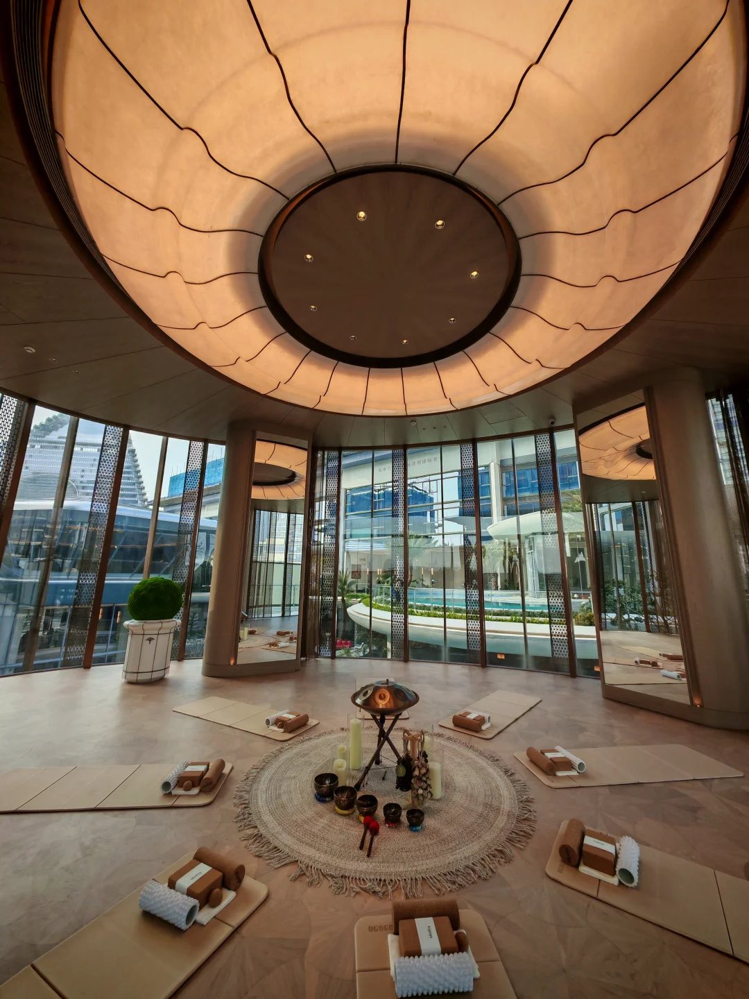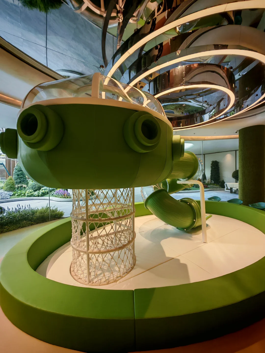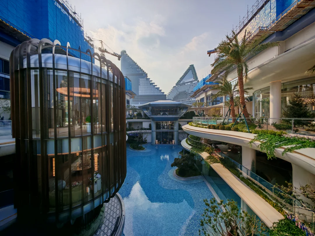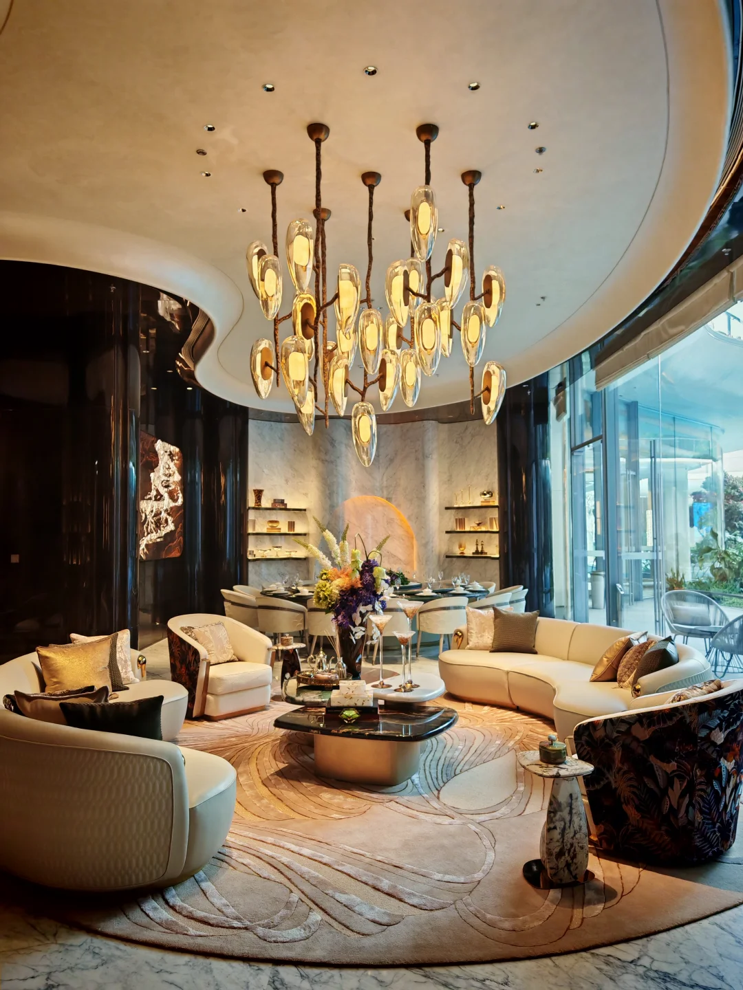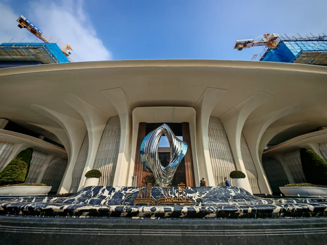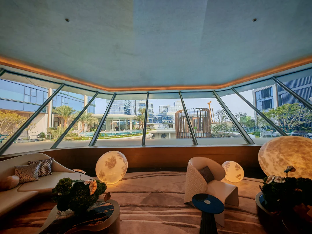 整个公区在我看来是科技感和艺术感的结合,总裁会客厅的造型跟一个飞碟一样,很科技,而大量的曲线和拱门造型则很艺术。站在一层的中央景观轴往外望,一侧是vivo的三角大楼,一侧是钉钉总部,你会感觉这个楼盘是深度嵌入在未科的宏大叙事中的。