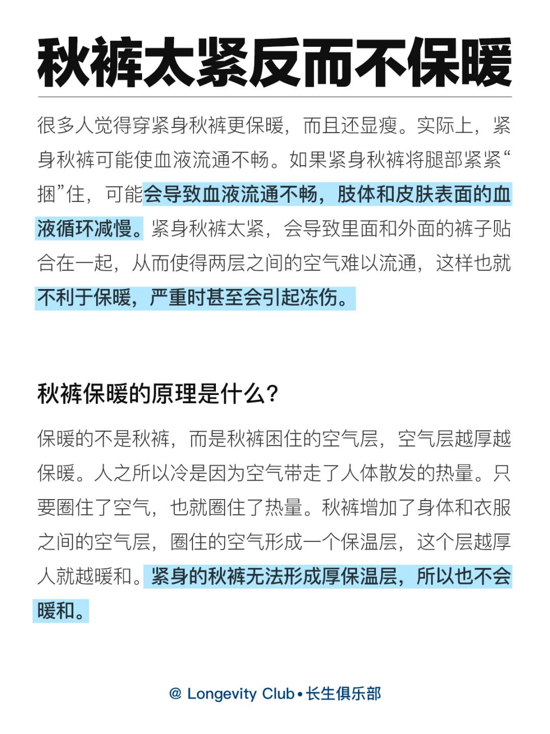 降温了,冬天正式来临了,宝子们的秋裤都穿上了吗?但是很多人不知道,秋裤太紧反而不保暖,可能会导致血液流通不畅,肢体和皮肤表面的血液循环减慢。紧身秋裤太紧,会导致里面和外面的裤子贴合在一起,从而使得两层之间的空气难以流通,这样也就不利于保暖,严重时甚至会引起冻伤。