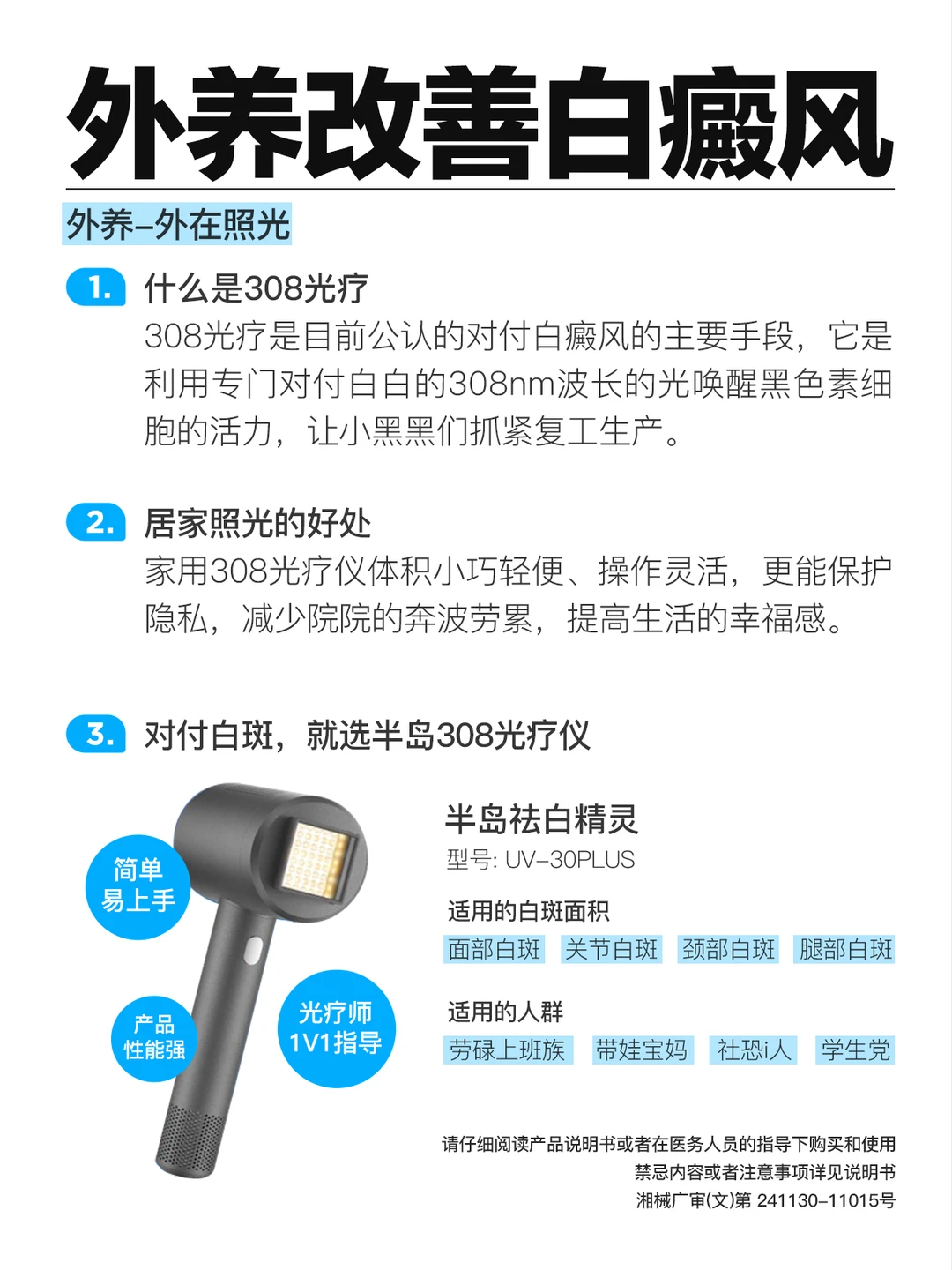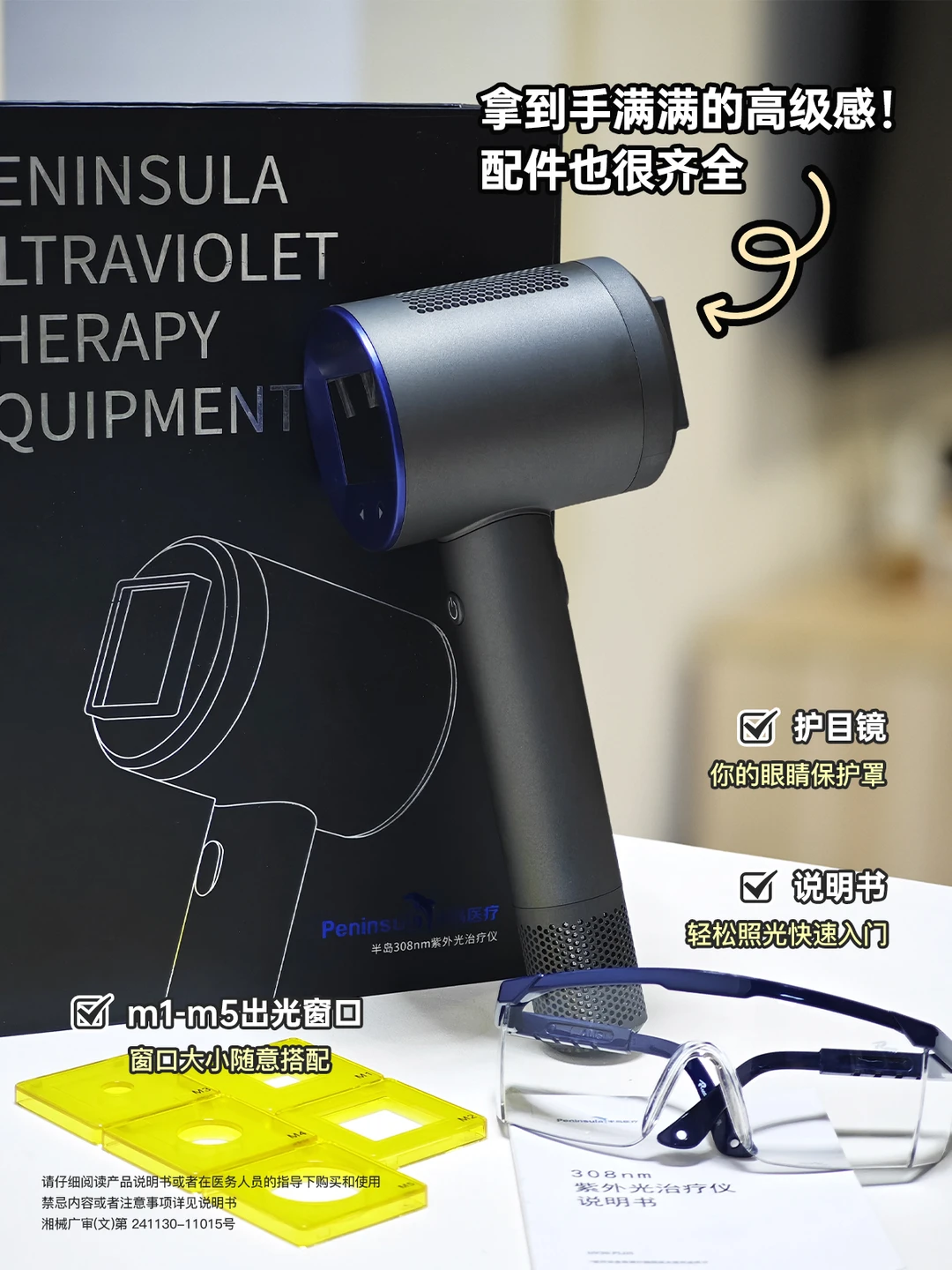 308光疗是目前公认的对付白癜风的主要手段,它是利用专门对付白白的308nm波长的光来唤醒黑色素细胞的活力,让小黑黑们复工生产。这款家用版的半岛308光疗仪就很适合在家用——体积小巧轻便、操作灵活;更能保护隐私,减少院院的奔波劳累,提高生活的幸福感。