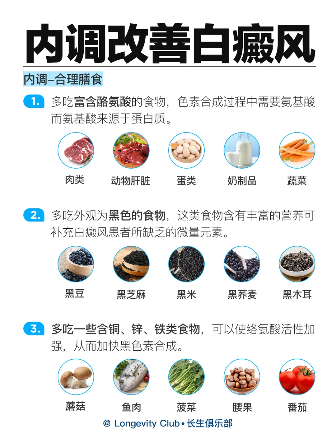 多吃富含蛋白质类、铜、铁、锌类食物,补充身体所需营养物质,帮助酪氨酸酶的合成,促进黑色S的生成。(食物参考附图)