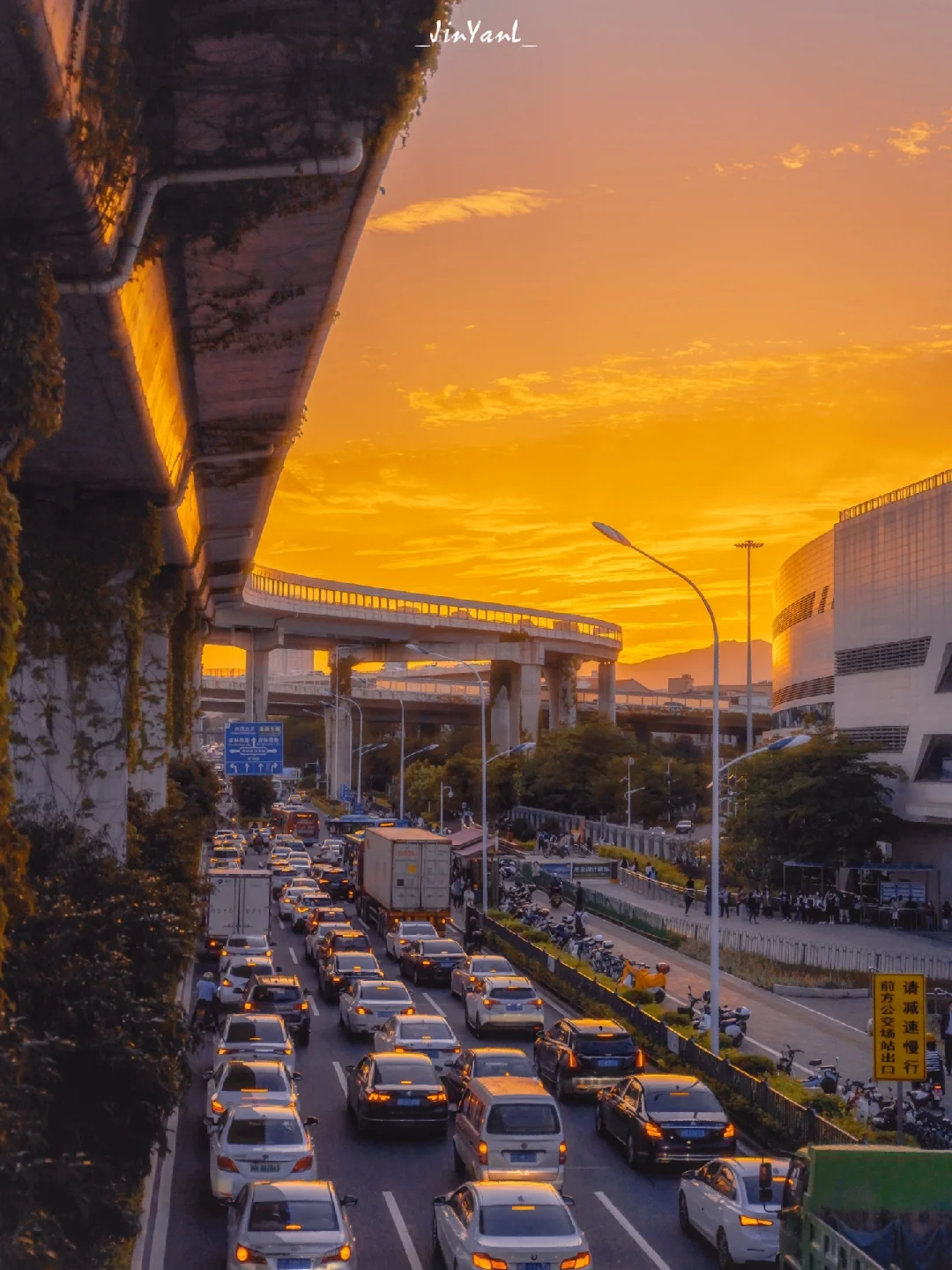 一抬头看到橘色的天空立刻冲上天桥