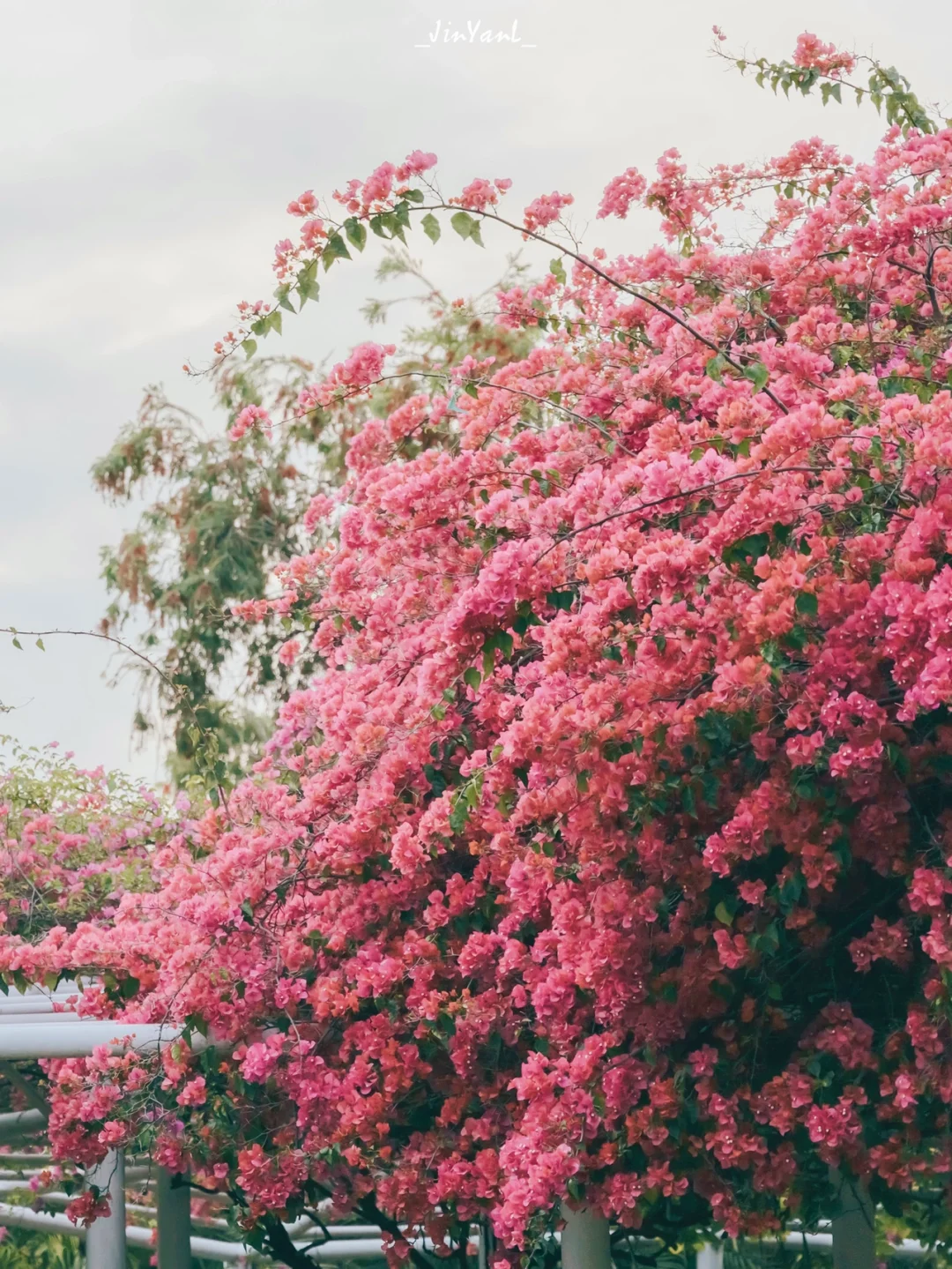 没想到乘船处茶亭上的多色三角梅瀑布都开了