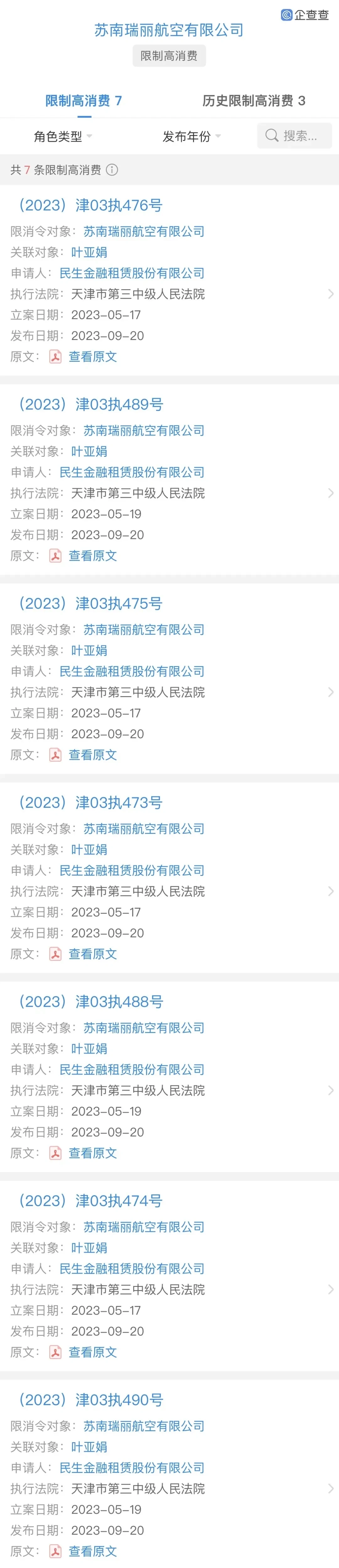 尤其是2023年9月20日这一天,天津市第三中级人民法院对瑞丽航空一连下发了7份限高令。