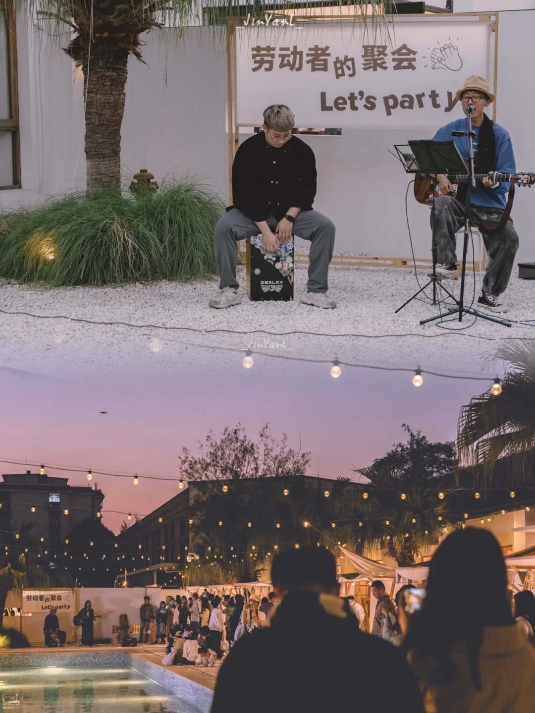 2⃣️ 日落前后伴着乐队演奏,坐在池边看夕阳超棒!