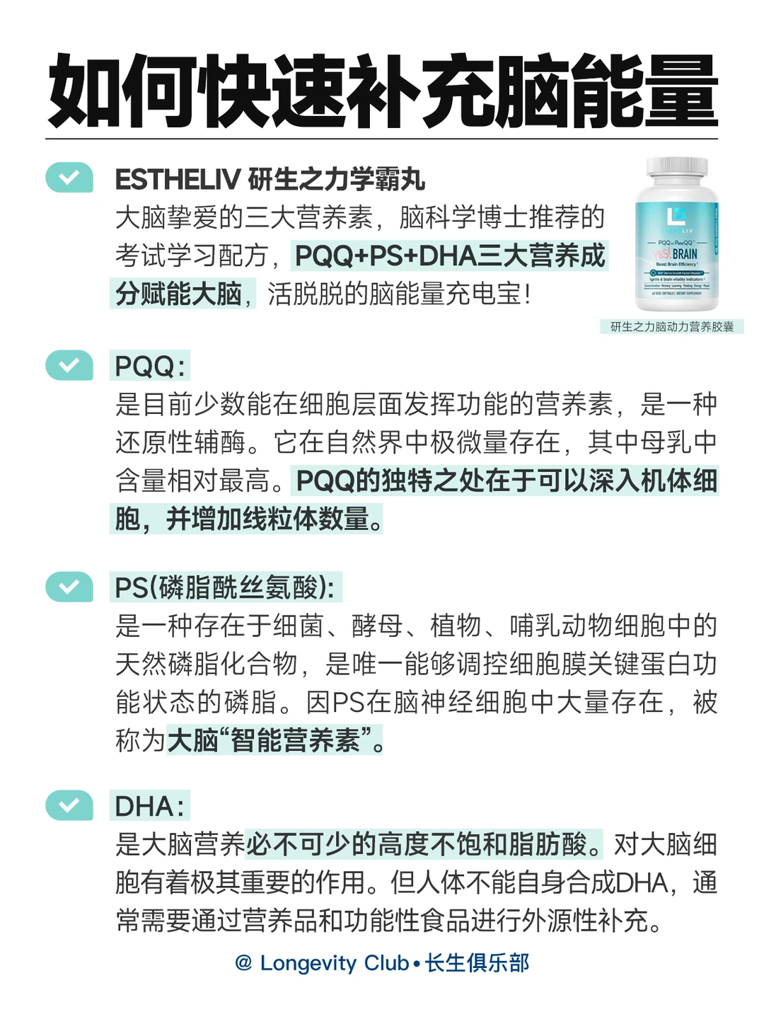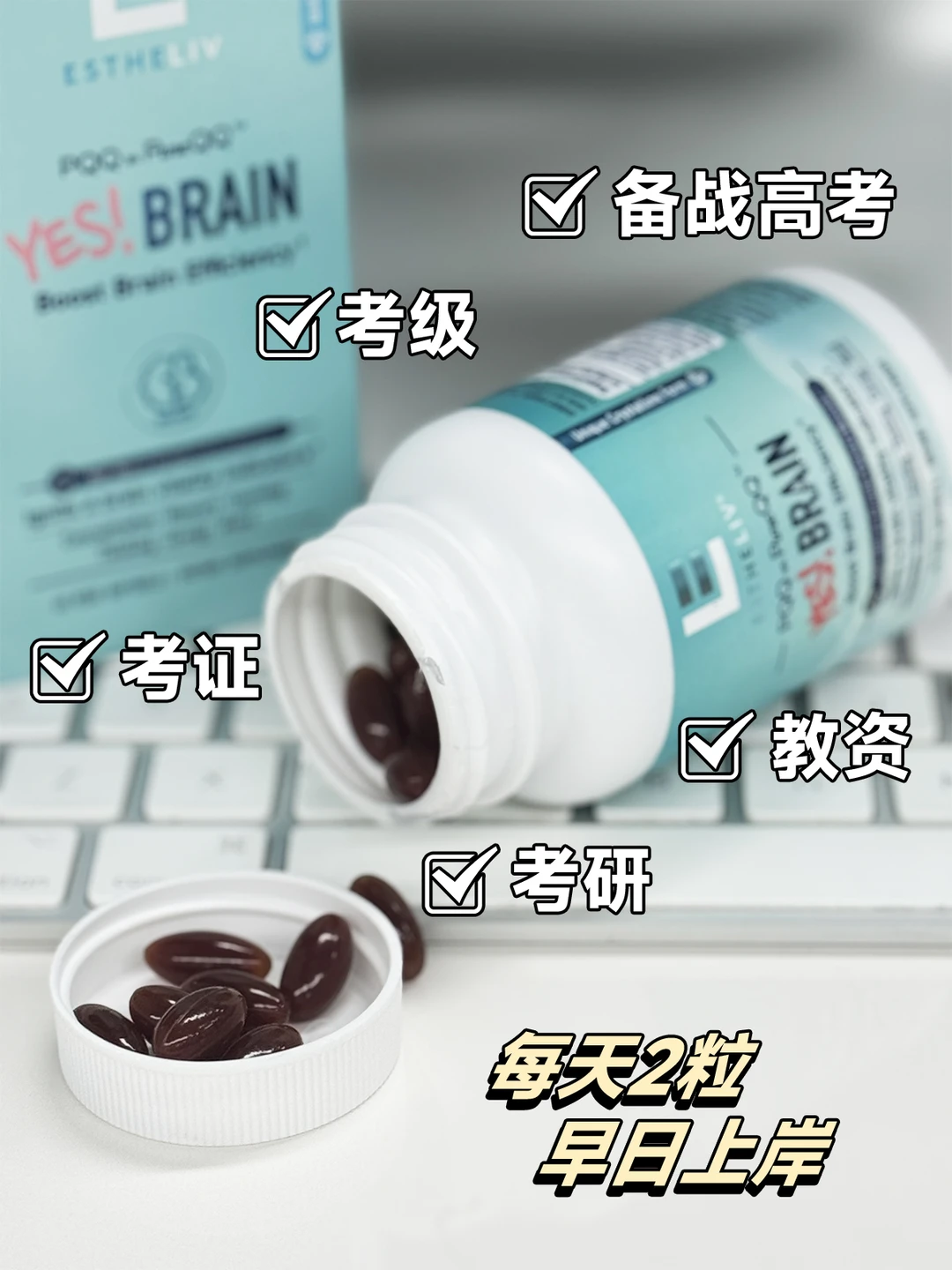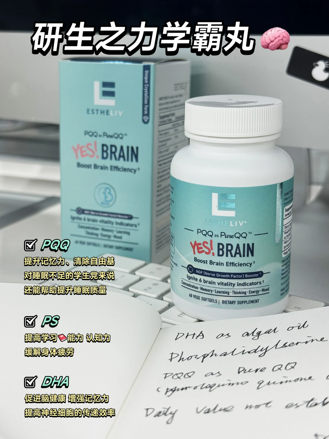 ✅推荐大家ESTHELIV 研生之力学霸丸,大脑挚爱的三大营养素。脑科学博士推荐的考试学习配方,PQQ+PS+DH三大营养成分赋能大脑,活脱脱的脑能量充电宝!