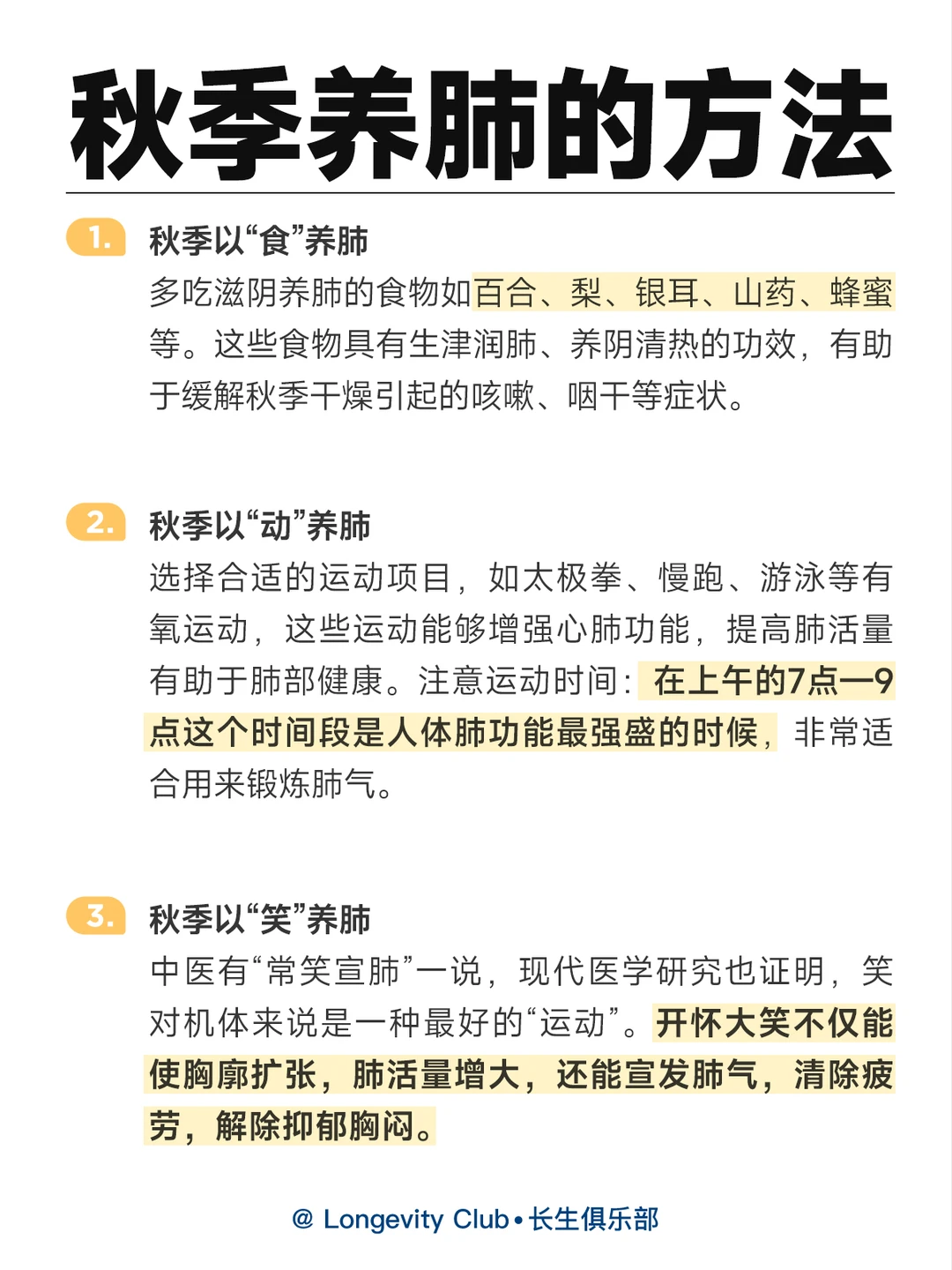 3.秋季以“笑”养肺,中医有“常笑宣肺”一说,现代医学研究也证明,笑对机体来说是一种最好的“运动”。开怀大笑不仅能使胸廓扩张,肺活量增大,还能宣发肺气,清除疲劳,解除抑郁胸闷。