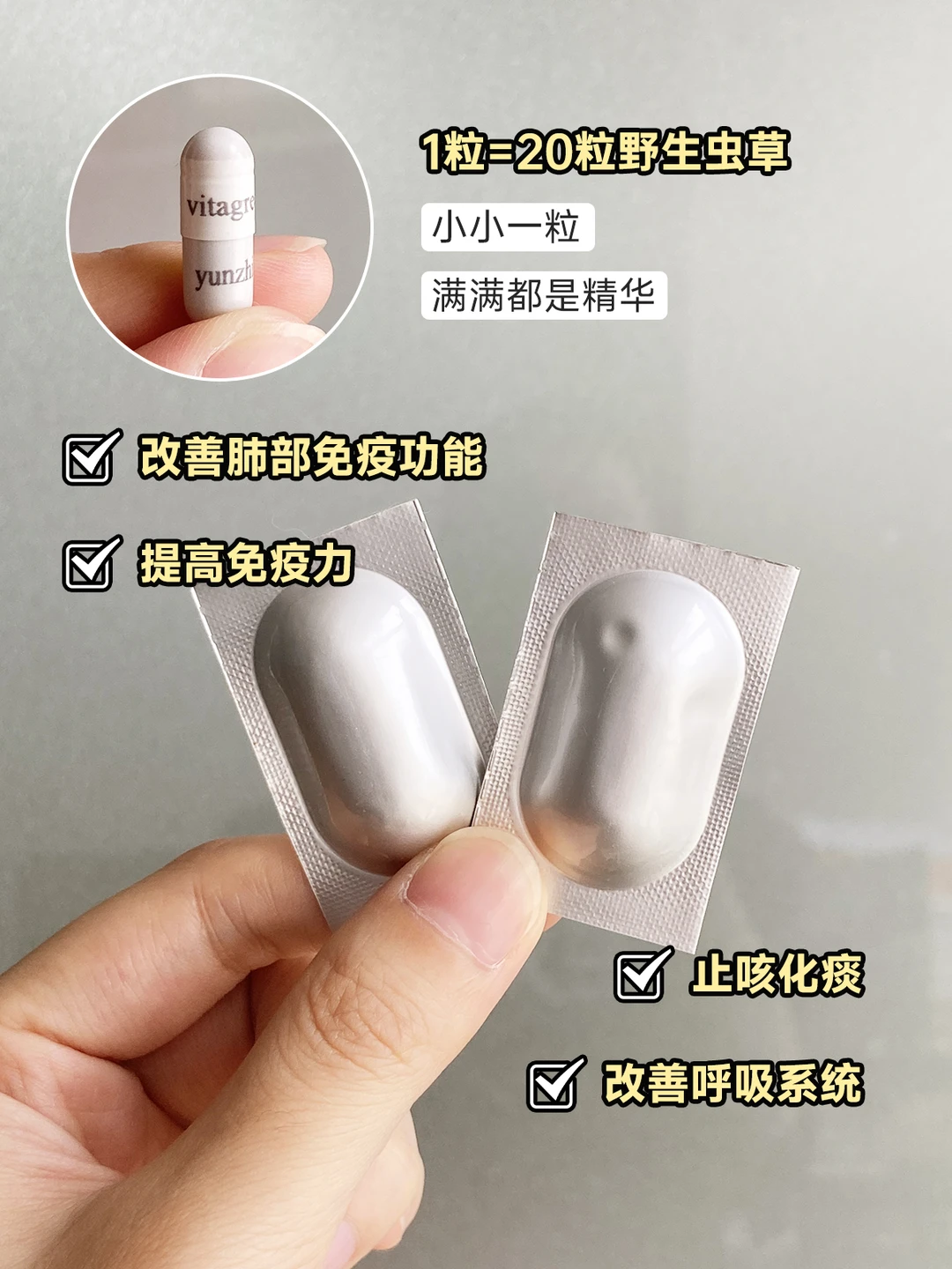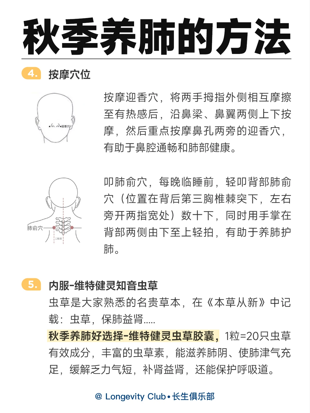 5.内服-维特健灵知音虫草,虫草是大家熟悉的名贵草本,在《本草从新》中记载:虫草,保肺益肾...秋季养肺好选择-维特健灵虫草胶囊,1粒=20只虫草有效成分,丰富的虫草素,能滋养肺阴、使肺津气充足,缓解乏力气短,补肾益肾,还能保护呼吸道。